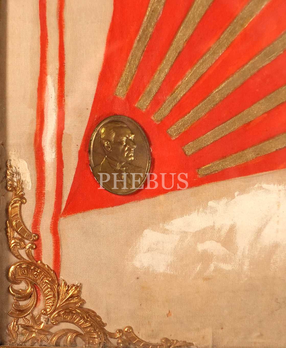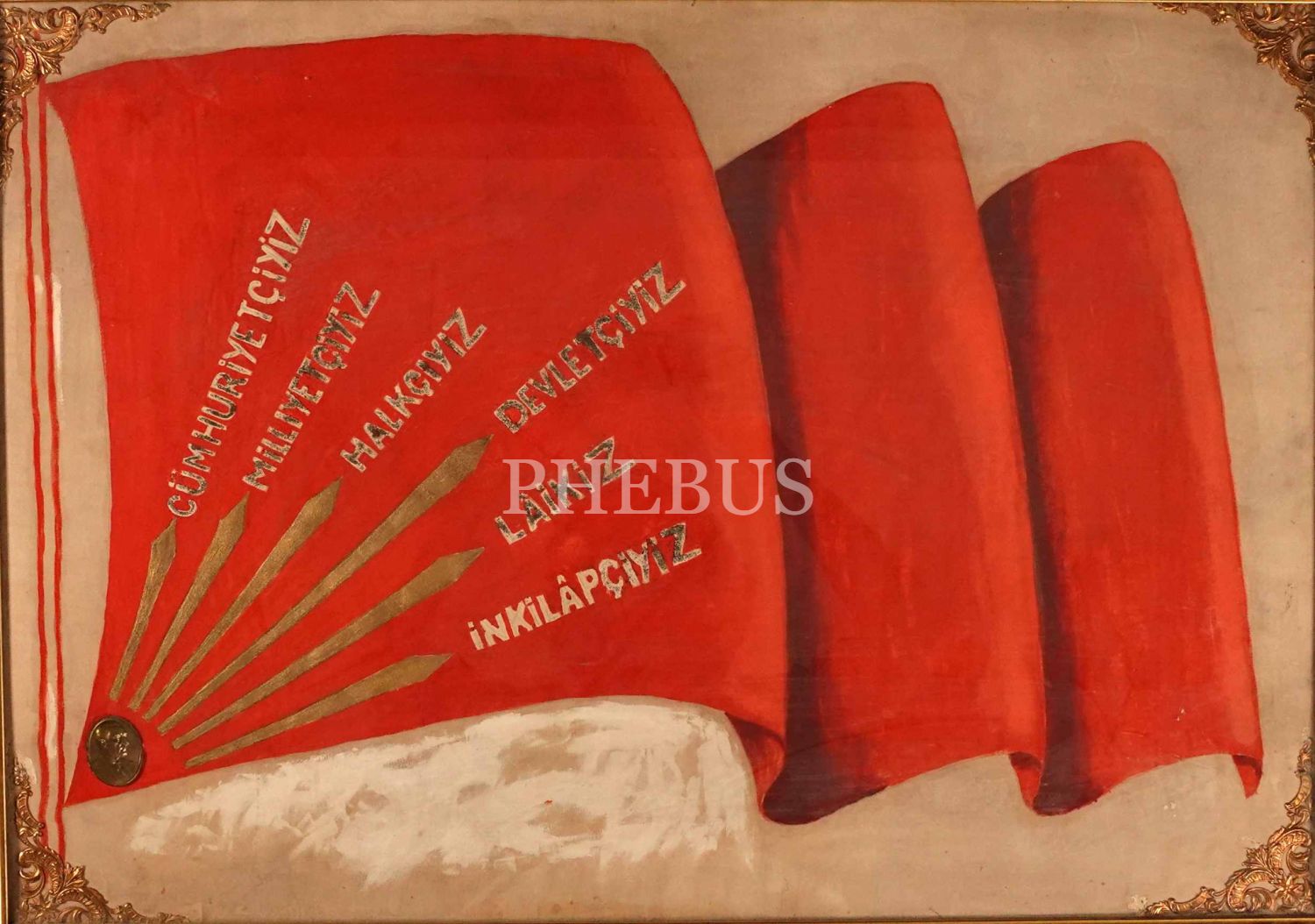 Bez üzerine, orijinal çizim ve boyama, köşeleri çerçeve içinde kabartma altın yaldız süslemeli, dişi baskı / oyma Mustafa Kemal Atatürk rozetli, altı ok simgeli CHP bayrağı...