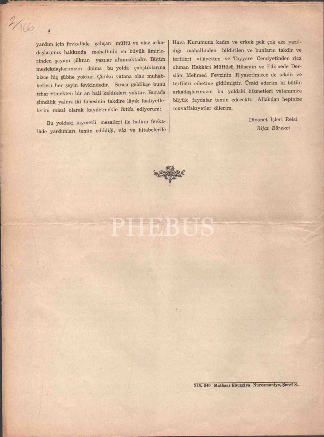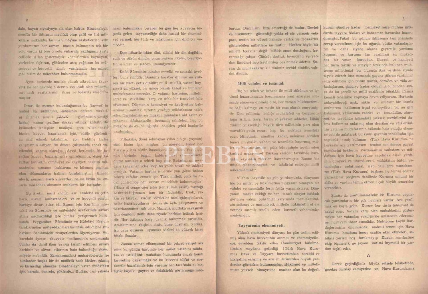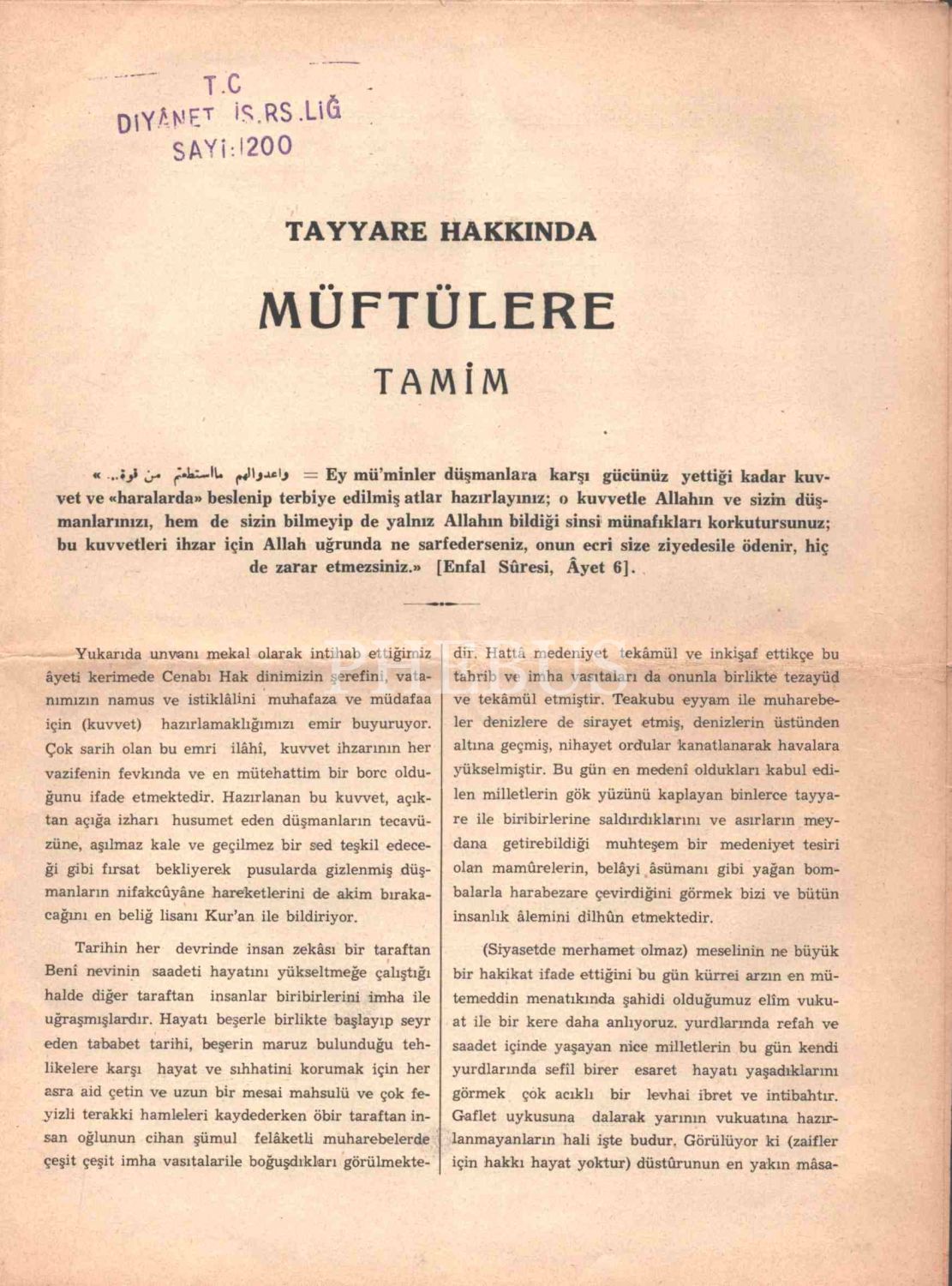 "Diyanet İşleri Reisi" Rifat Börekci tarafından kaleme alınan "Tayyare Hakkında Müftülere Tamim" başlıklı broşür, Matbaai Ebüzziya, 4 sayfa, 23x30 cm