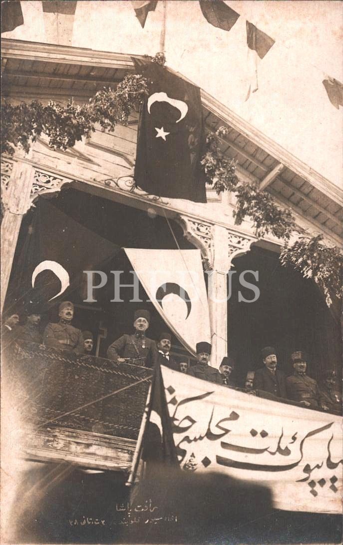 Balkona asılan bez afişte "Türkiye Büyük Millet Meclisi Hükümeti" yazmaktadır. Fotoğrafta, Fenerbahçe Spor Kulübü´nün kurucularından Nurizade Ziya [Songülen] Bey de görülmektedir.