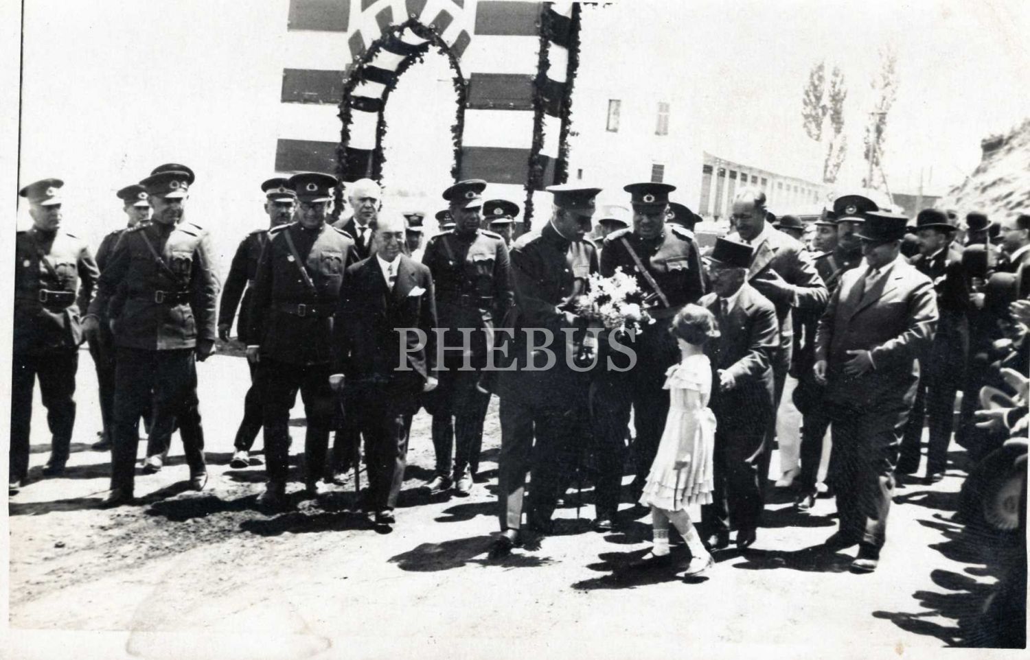 İran Şahı Rıza Pehlevi, İstanbul ziyaretinde küçük bir kız tarafından kendisine sunulan çiçek demetini kabul ediyor, 9x14 cm