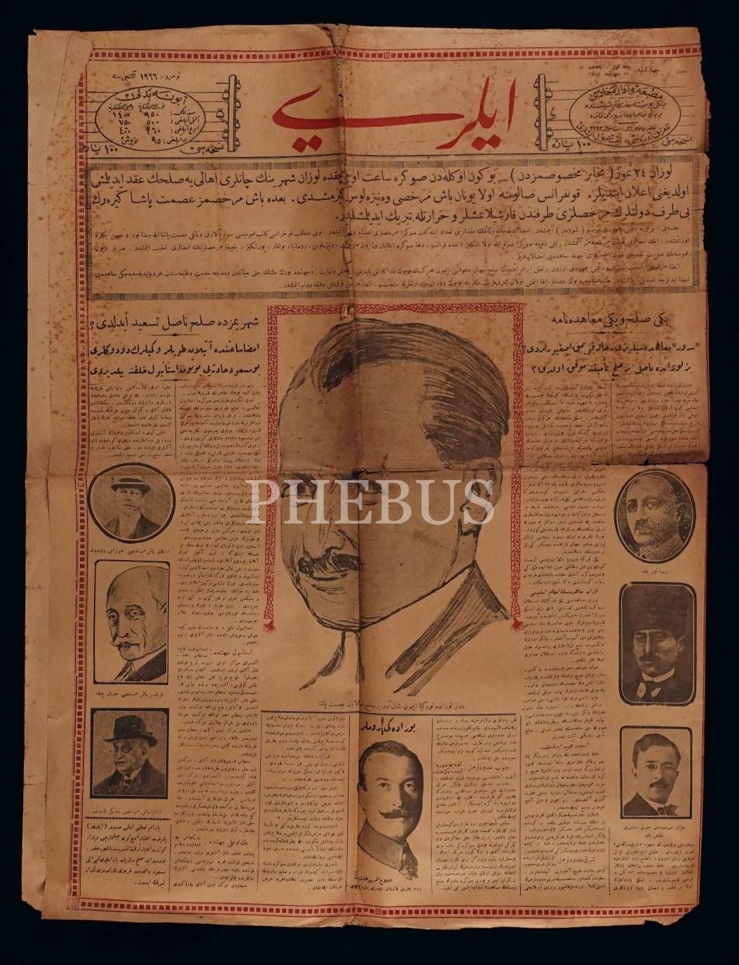 Kapağında " Dün Lozan´da Türkiye için şanâver bir sulh imzalayan İsmet Paşa" yazılı İsmet Paşa´nın çizimi bulunan, 11 Zilhicce 1341 tarihli İleri Gazetesi, 4 sayfa, 46x63 cm...