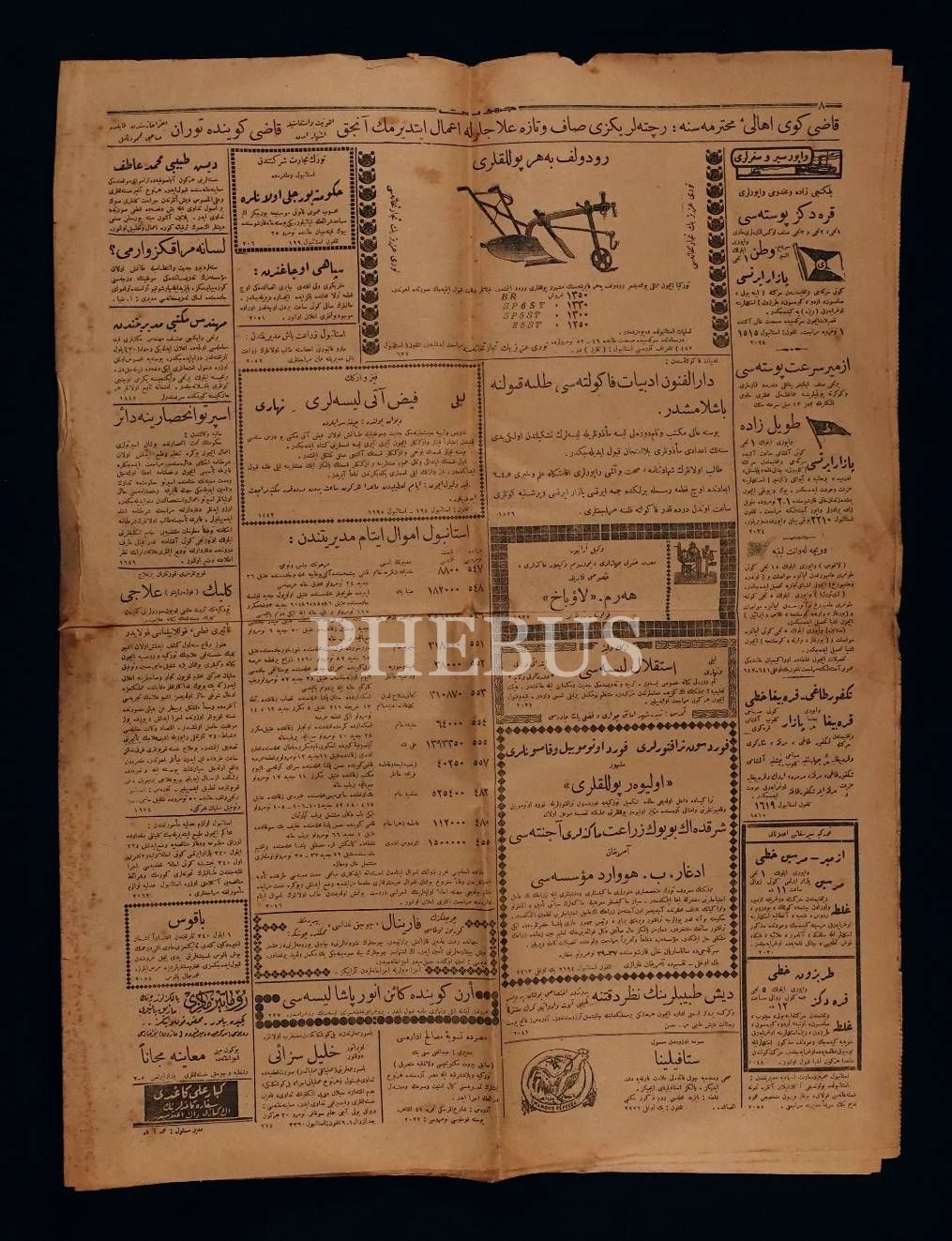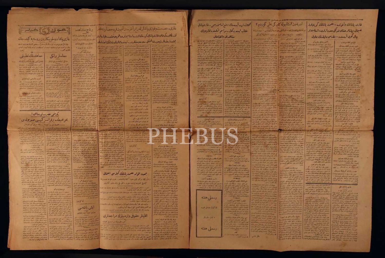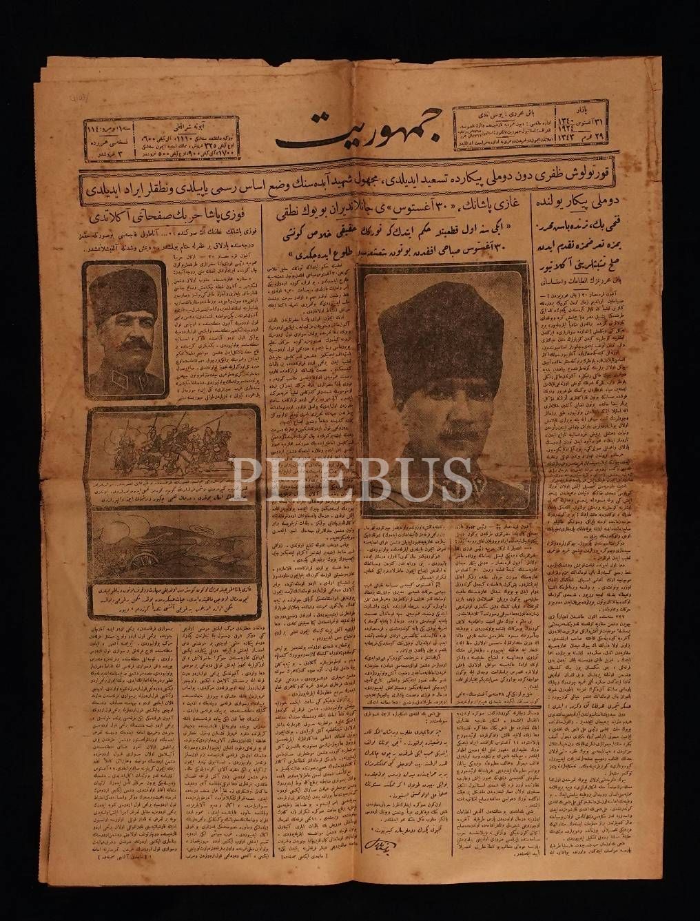 Lot 206: "Kurtuluş Zaferi dün devamlı peygarda tes'id edildi, meçhul şehid abidesinin esas resmi yapıldı ve nutuklar irad edildi." manşetli Mustafa Kemal Atatürk ve Fevzi Çakmak görselli, 29 Muharrem 1343 tarihli Cumhuriyet Gazetesi, 8 sayfa, 44x60 cm...