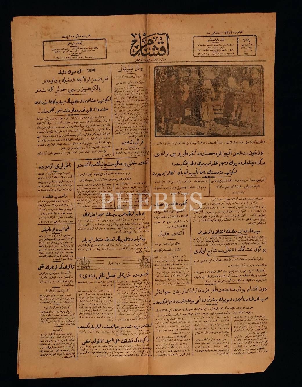 " Bozgun: Düşman Afyonkarahisar´da ağır toplarını bıraktı" manşetli ve Cephe arkasında ordumuzun cephanesini taşıyan şehid ve gazi anaları görselli, 7 Muharrem 1341 tarihli Akşam Gazetesi, 4 sayfa, 41x56 cm...