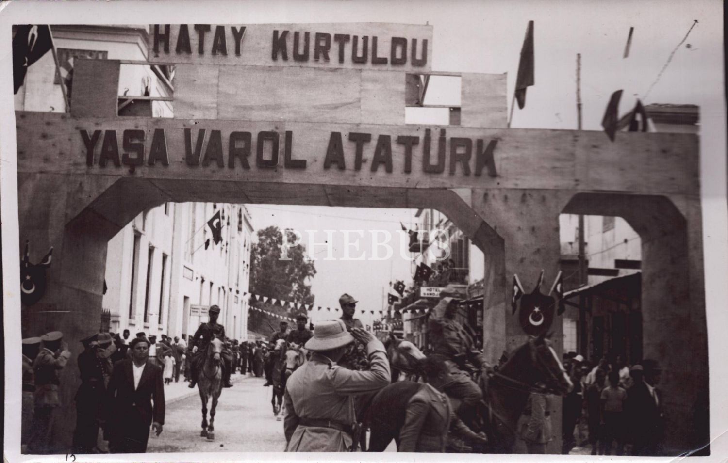 Hatay´ın kurtuluşu merasimlerinde kurulmuş taklarda "Varol Atatürk", "Ataya Saygı Orduya Selam", Yaşasın Ulu Ata", " Kırk Asırlık Türk Yurdu Esir Kalamaz", "Sen Ben Yok Biz Varız" şeklinde yazılar yazılmıştır.