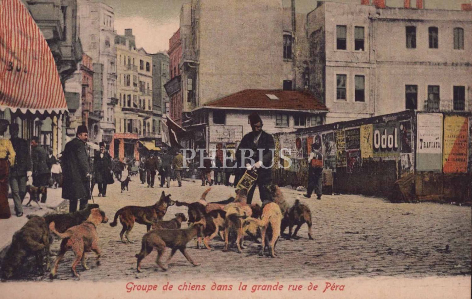 Pera´da (İstanbul) bir grup köpek görselli kartpostal, ed.: Bon Marche - Pera, "Groupe de chiens dans la grande rue de Pera", 14x9 cm...