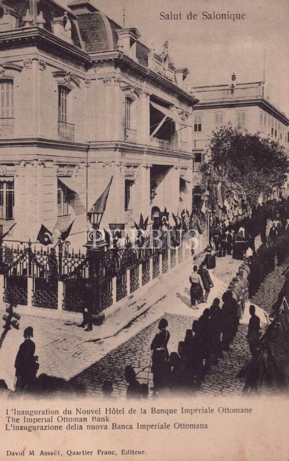 Duvarları Türk bayraklarıyla süslenmiş Yeni İmperial Ottoman Bank Oteli´nin açılışı görselli kartpostal, ed.: David. M. Assaéel, " Salut Salonique", 14x9 cm...