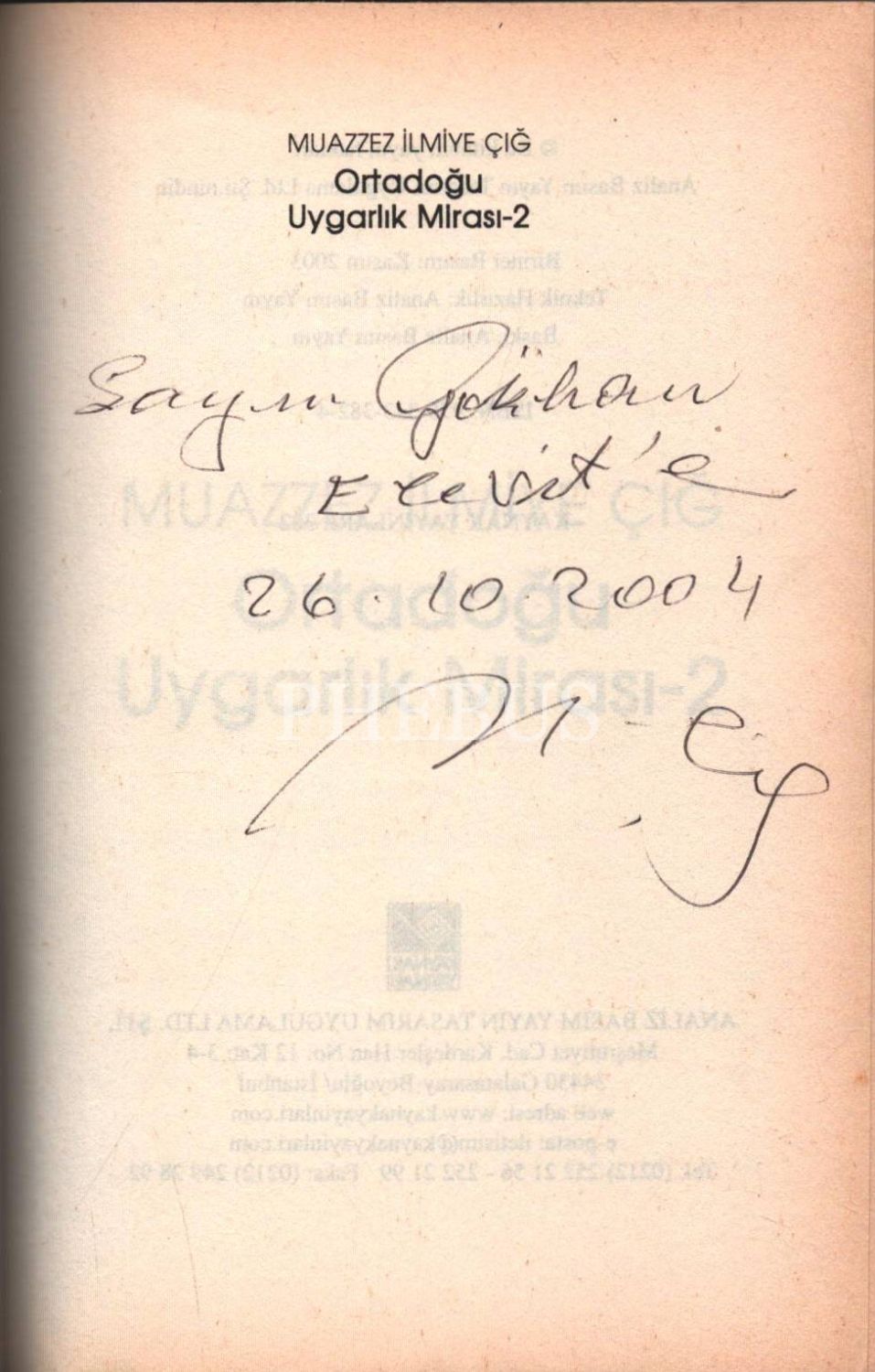 İthaf, "Sayın Gökhan Ecevit´e. 26.10.2004 M. Çığ" şeklindedir.