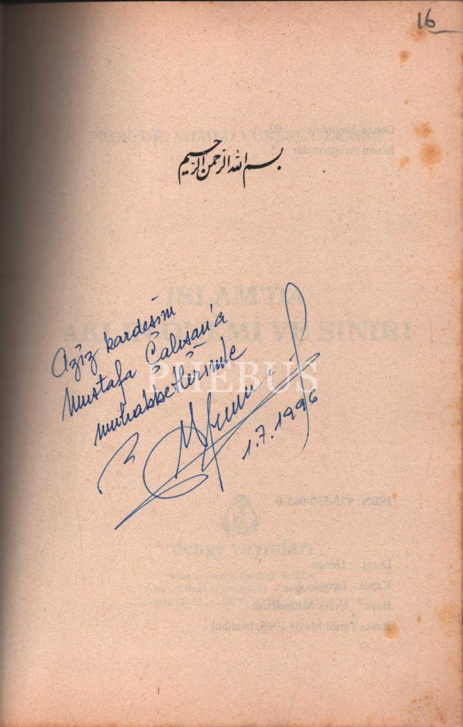 İthaf, "Aziz kardeşim Mustafa Çalışan´a muhabbetlerimle. A. Y. Özemre 1.7.1996" şeklindedir.