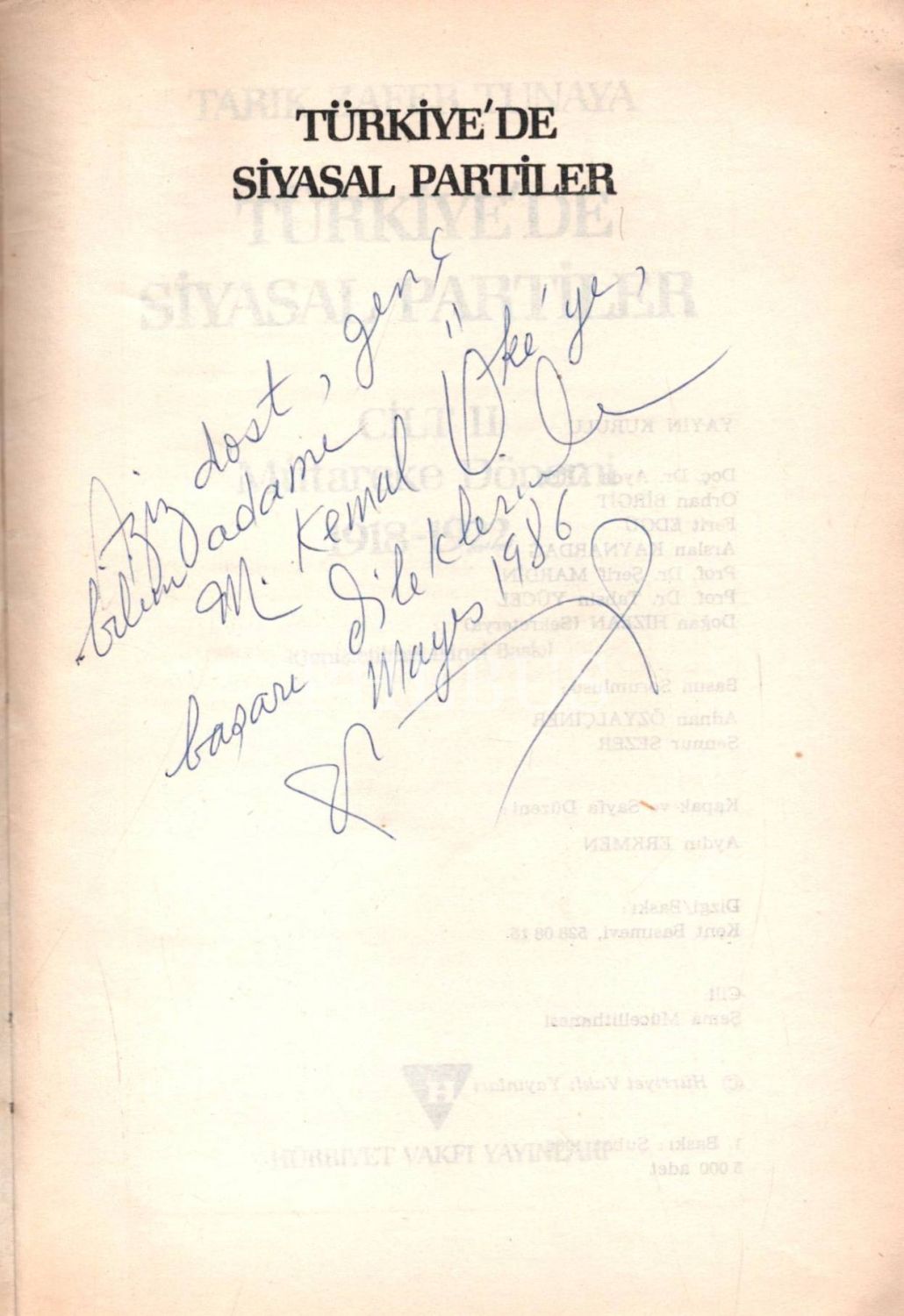 İthaf, "Aziz dost, genç bilim adamı M. [Mim] Kemal Öke´ye başarı dileklerimle. Mayıs 1986. Z. Tunaya" şeklindedir.