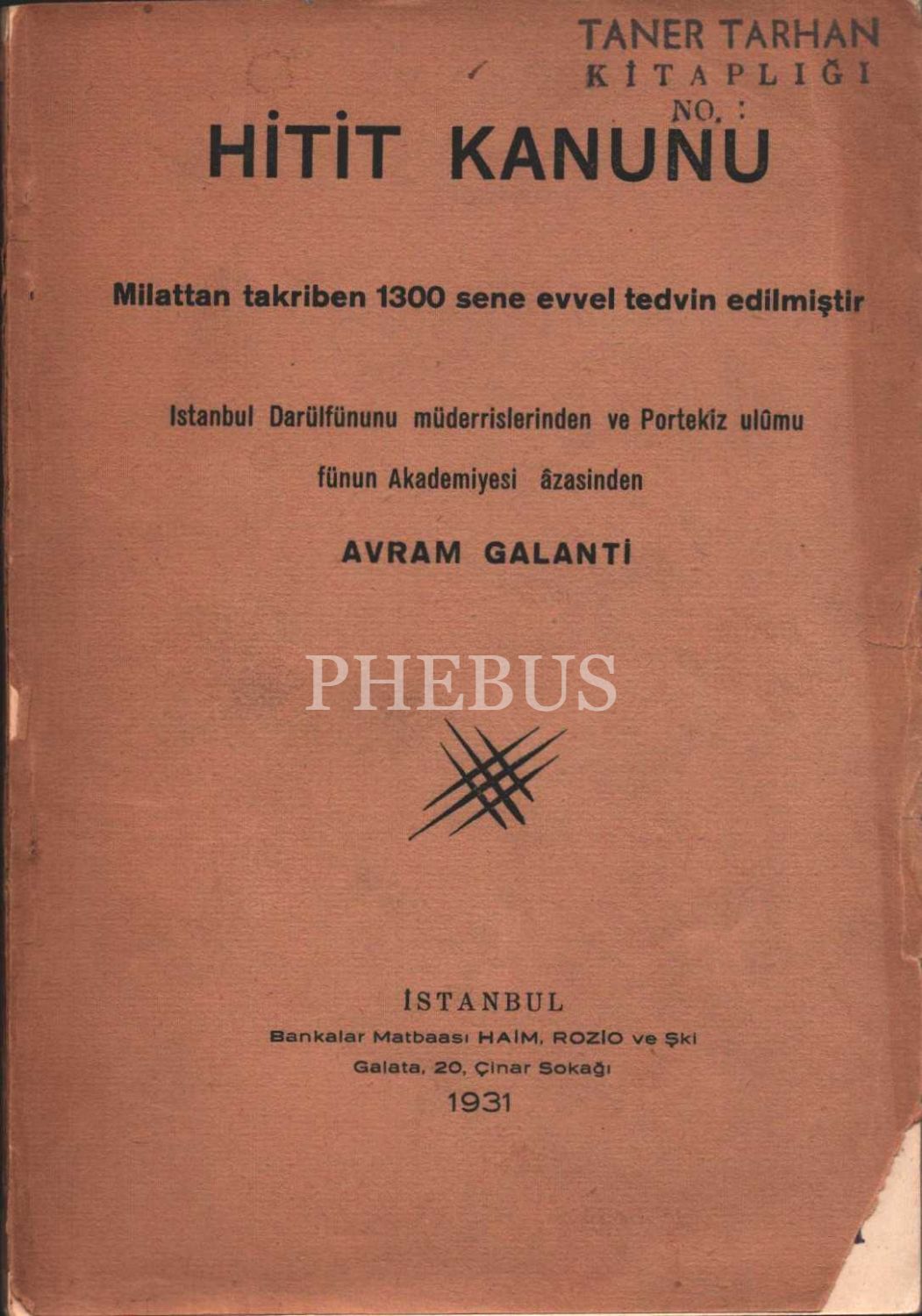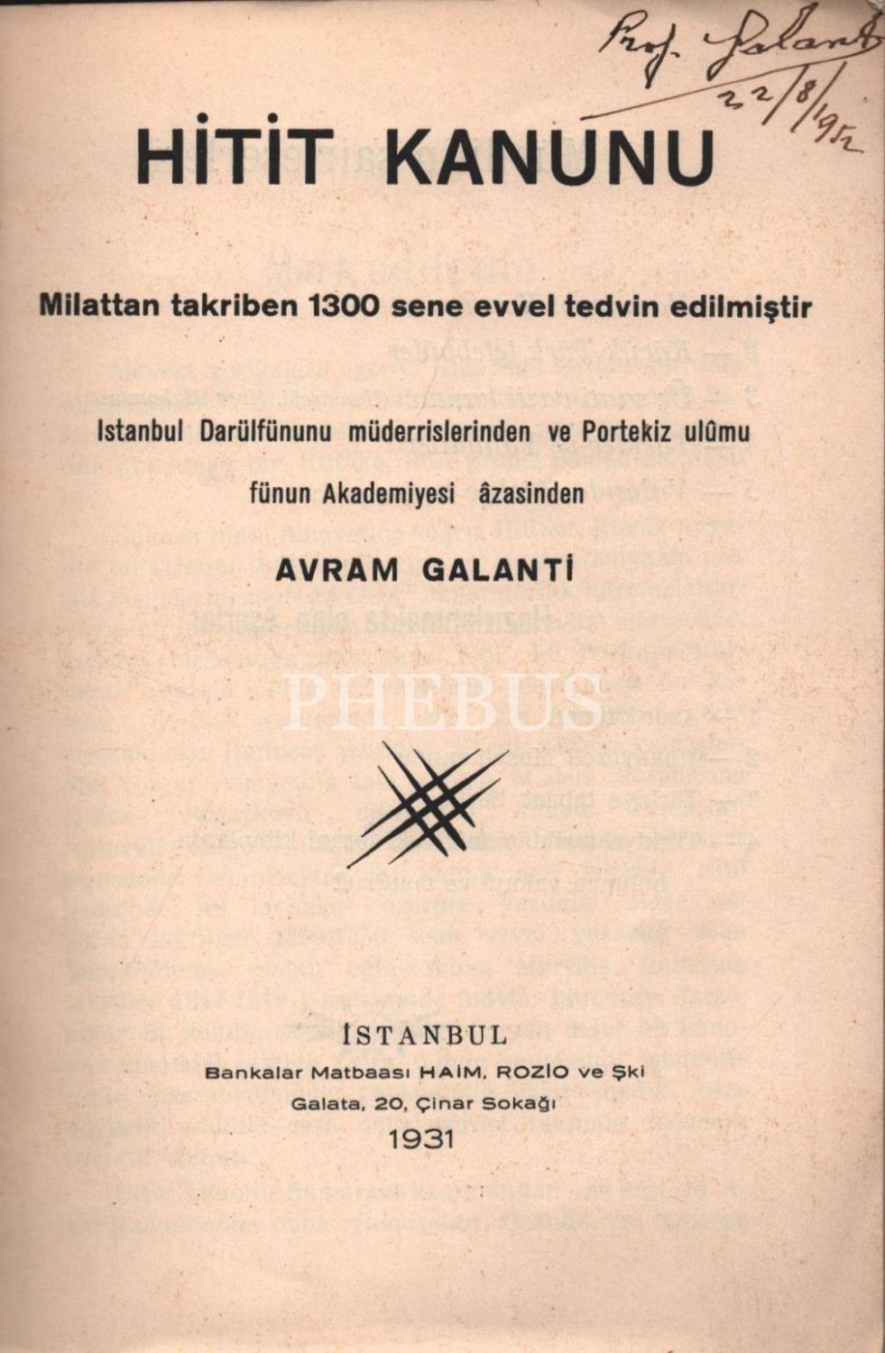 HİTİT KANUNU, Avram Galanti, 1931, Bankalar Matbaası, 50 sayfa, 14x20 cm, İthafsız İMZALI...