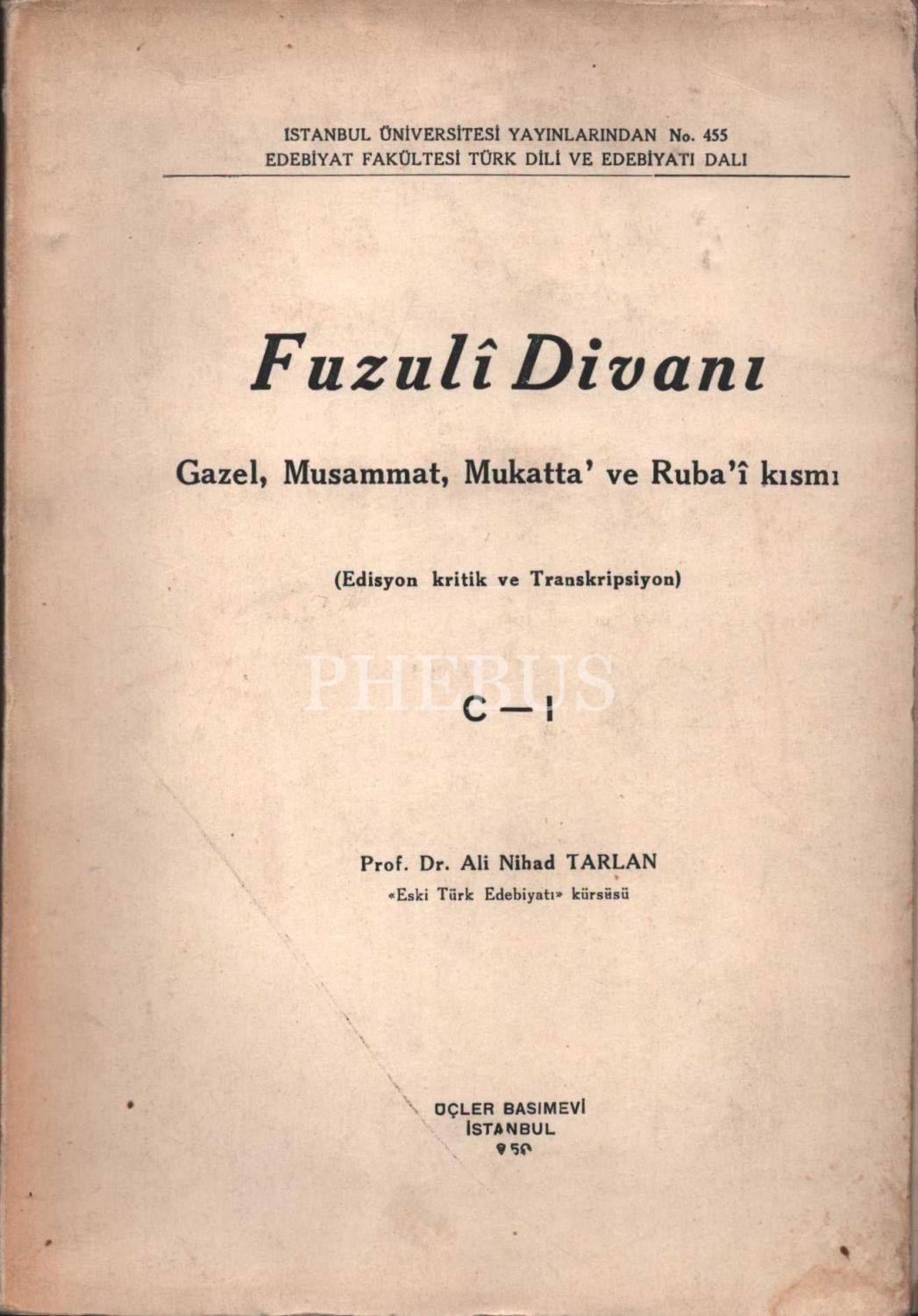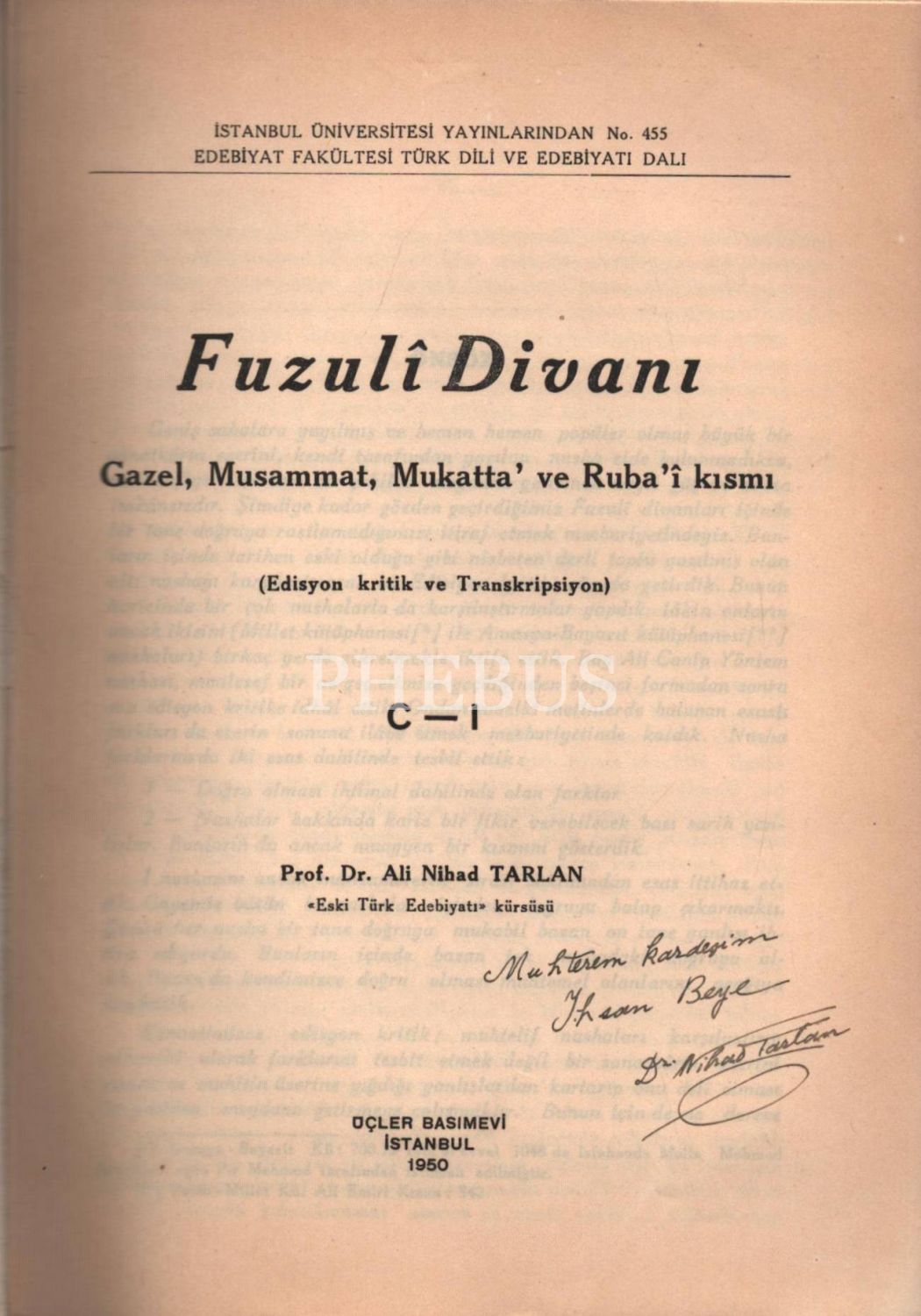 FUZULÎ DİVANI: Gazel, Musammat, Mukatta´ ve Ruba´î Kısmı (C-I), Ali Nihad Tarlan, 1950, Üçler Basımevi, 247 sayfa, 17x24 cm, İTHAFLI VE İMZALI...