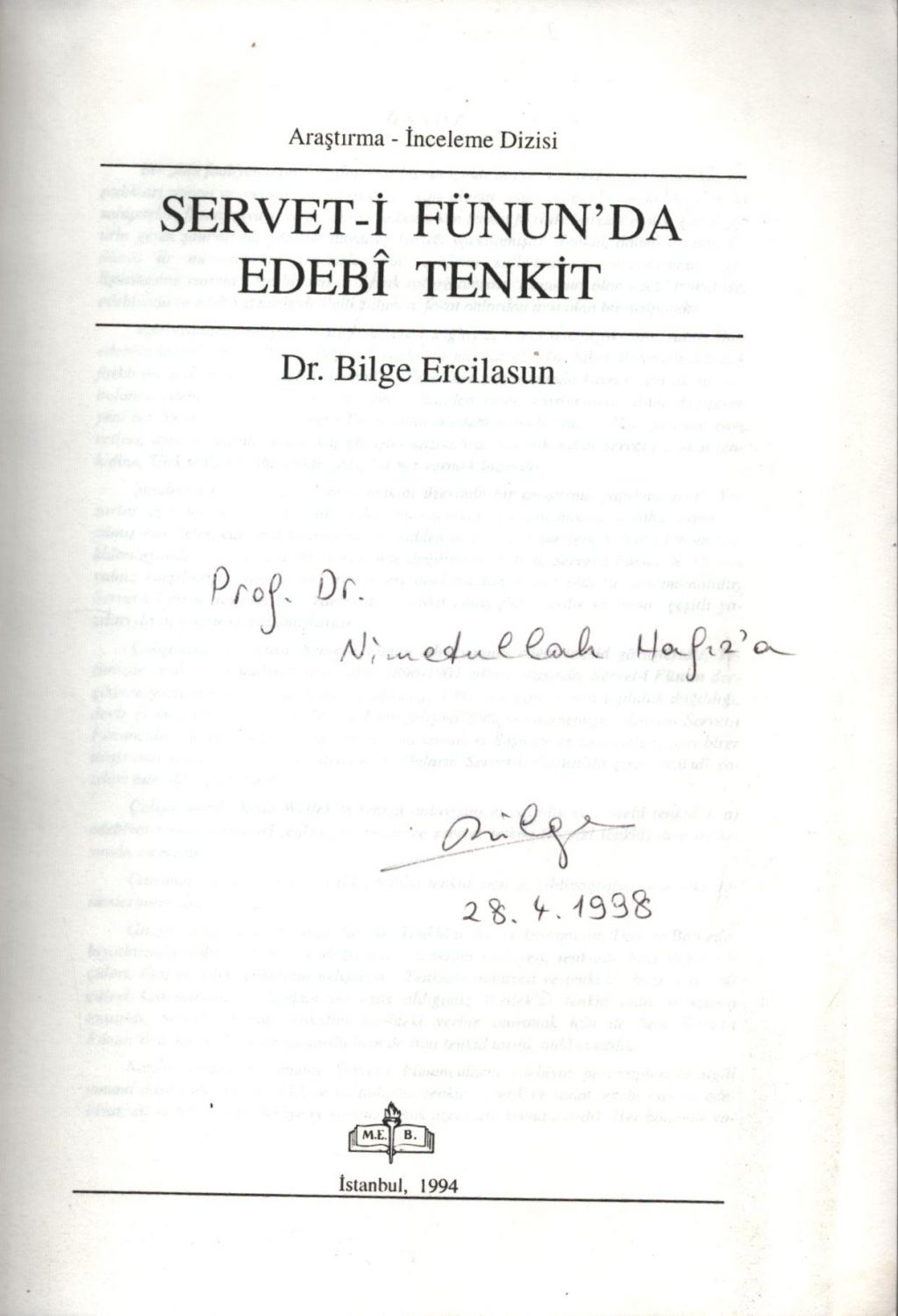 İthaf, "Prof. Dr. Nimetullah Hafız´a. Bilge. 28.4.1998" şeklindedir.