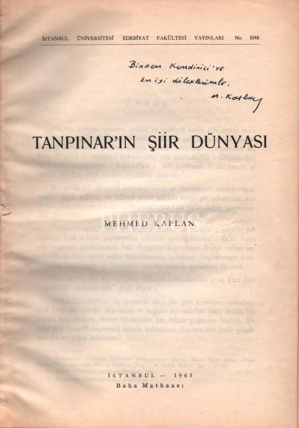 TANPINAR´IN ŞİİR DÜNYASI, Mehmed Kaplan, 1963, Baha Matbaası, 179 sayfa, 17x24 cm, İTHAFLI VE İMZALI...