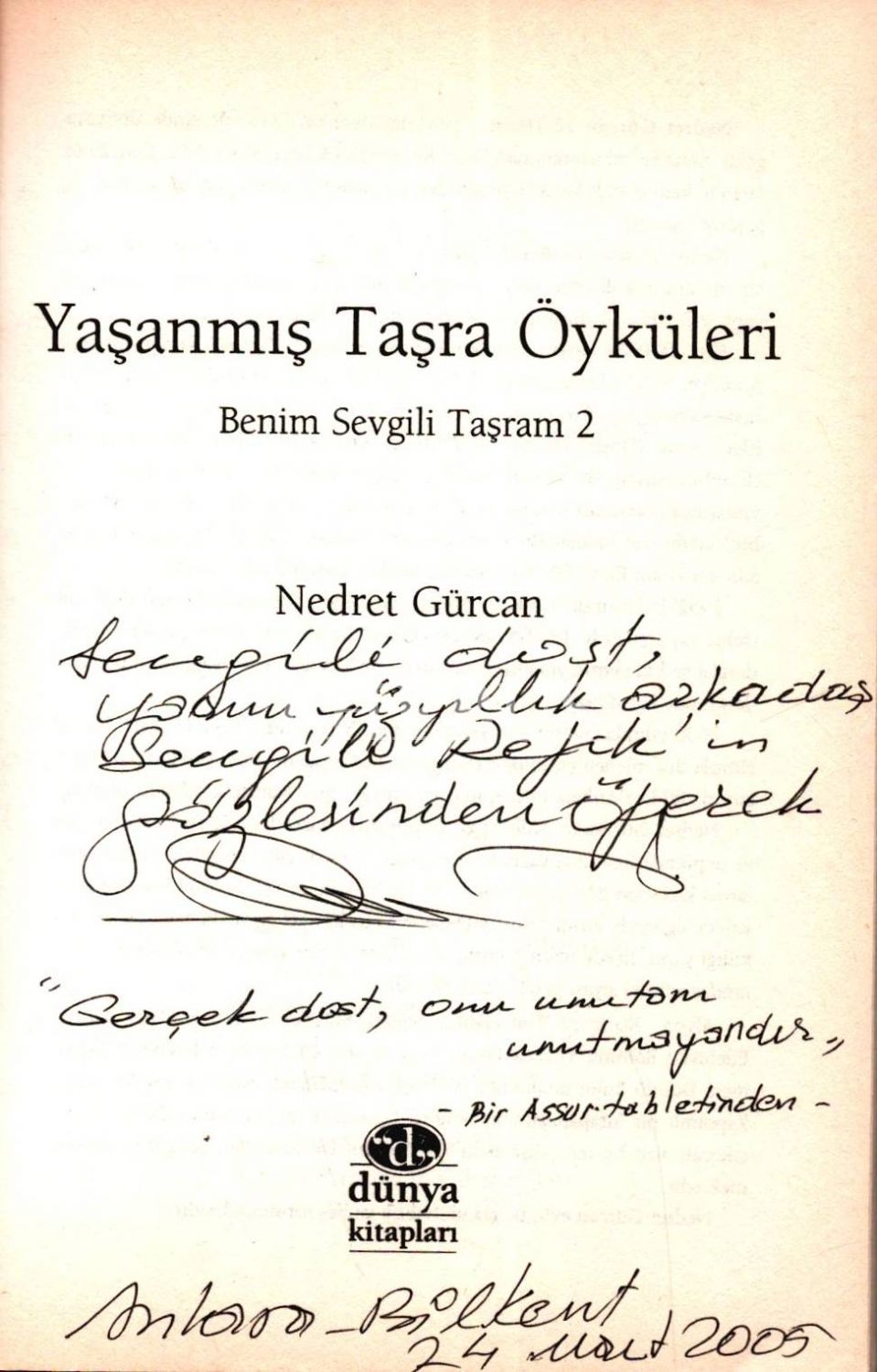 Sevgili dost, yarım yüzyıllık arkadaş Sevgili Refik´in gözlerinden öperek. N. Gürcan. ´Gerçek dost, onu unutanı unutmayandır´ -Bir Assur tabletinden- Ankara - Bilkent 24 Mart 2005" şeklindedir.