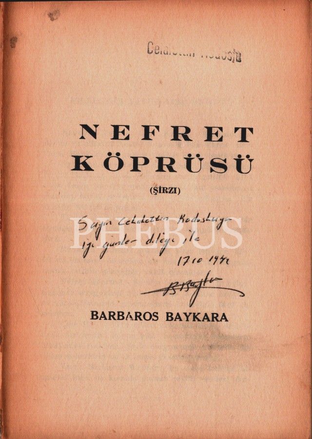 İthaf, "Sayın Celalettin Rodoslu´ya iyi günler dileği ile. 17.10.1974 B. Baykara" şeklindedir.