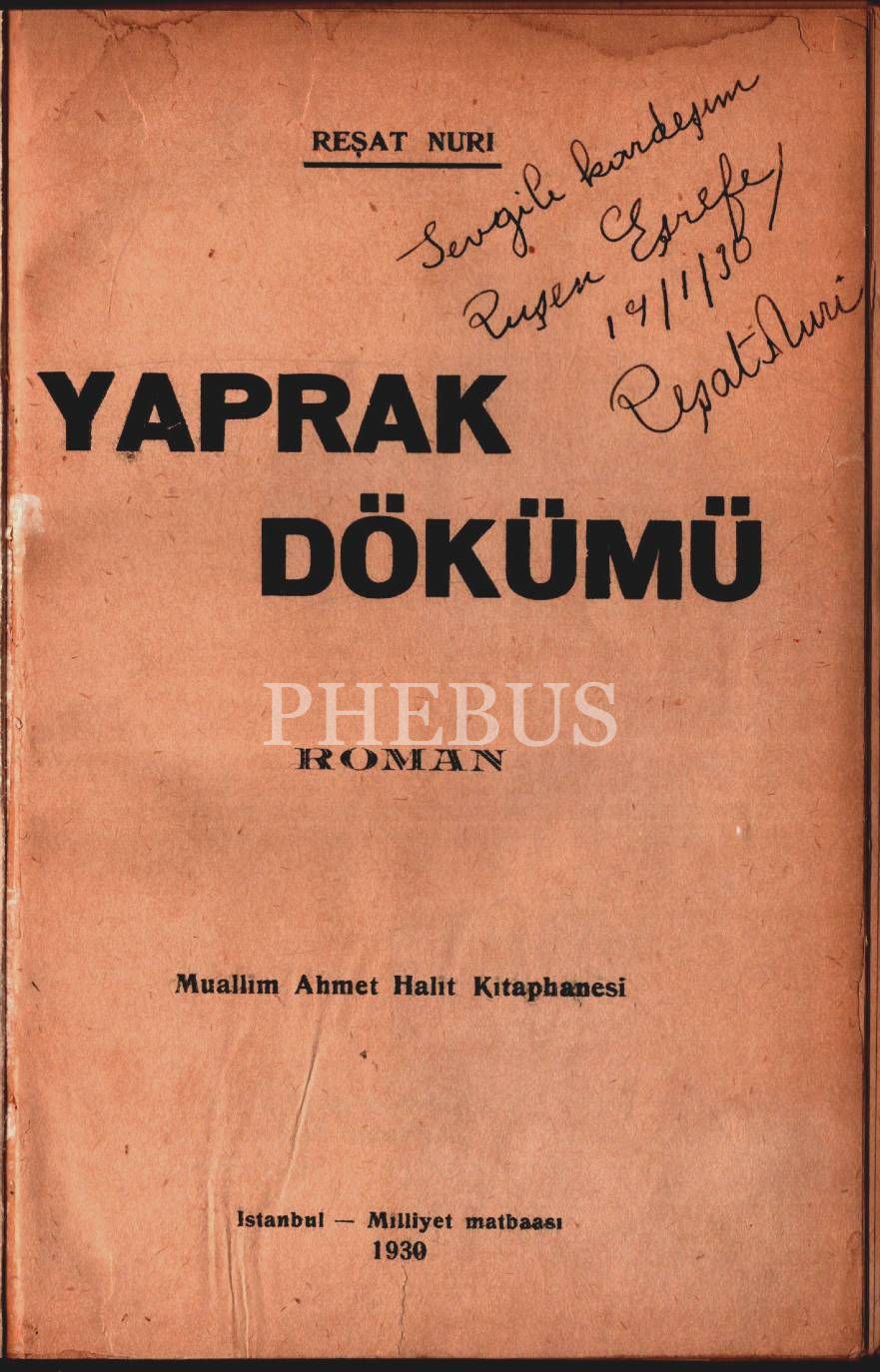 YAPRAK DÖKÜMÜ (Roman), Reşat Nuri, 1930, Milliyet Matbaası, 168 sayfa, 14x20 cm, İTHAFLI VE İMZALI...