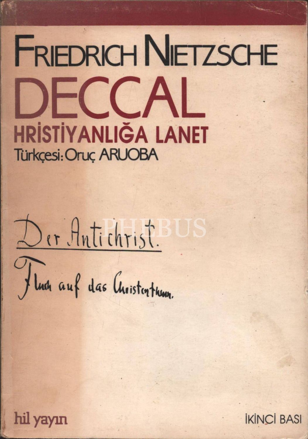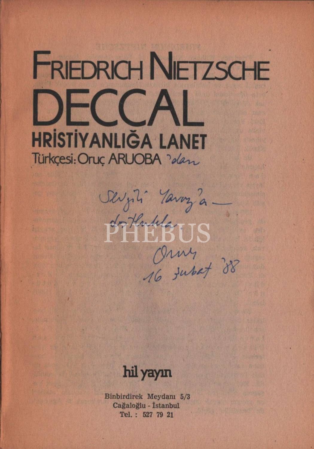 DECCAL HRİSTİYANLIĞA LANET, Frıedrıch Nietzsche, çeviren: Oruç Aruoba, 1987, Hil Yayın, 128 sayfa, 14x20 cm, İTHAFLI VE İMZALI...