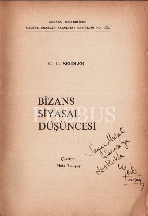 BİZANS SİYASAL DÜŞÜNCESİ, G. L. Seıdler, çeviren: Mete Tunçay, 1980, Ankara Üniversitesi Basımevi, 87 sayfa, 14x20 cm, İTHAFLI VE İMZALI...