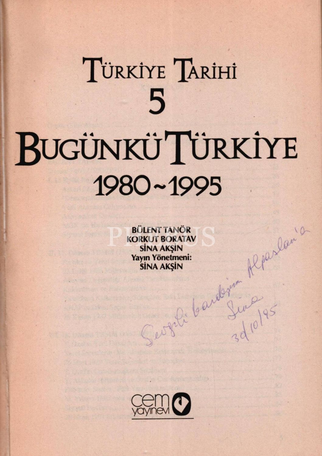 TÜRKİYE TARİHİ 5, Bülent Tanör, Korkut Boratav, Sina Akşin, 1995, Cem Yayınevi, 326 sayfa, 17x24 cm, İTHAFLI VE İMZALI...