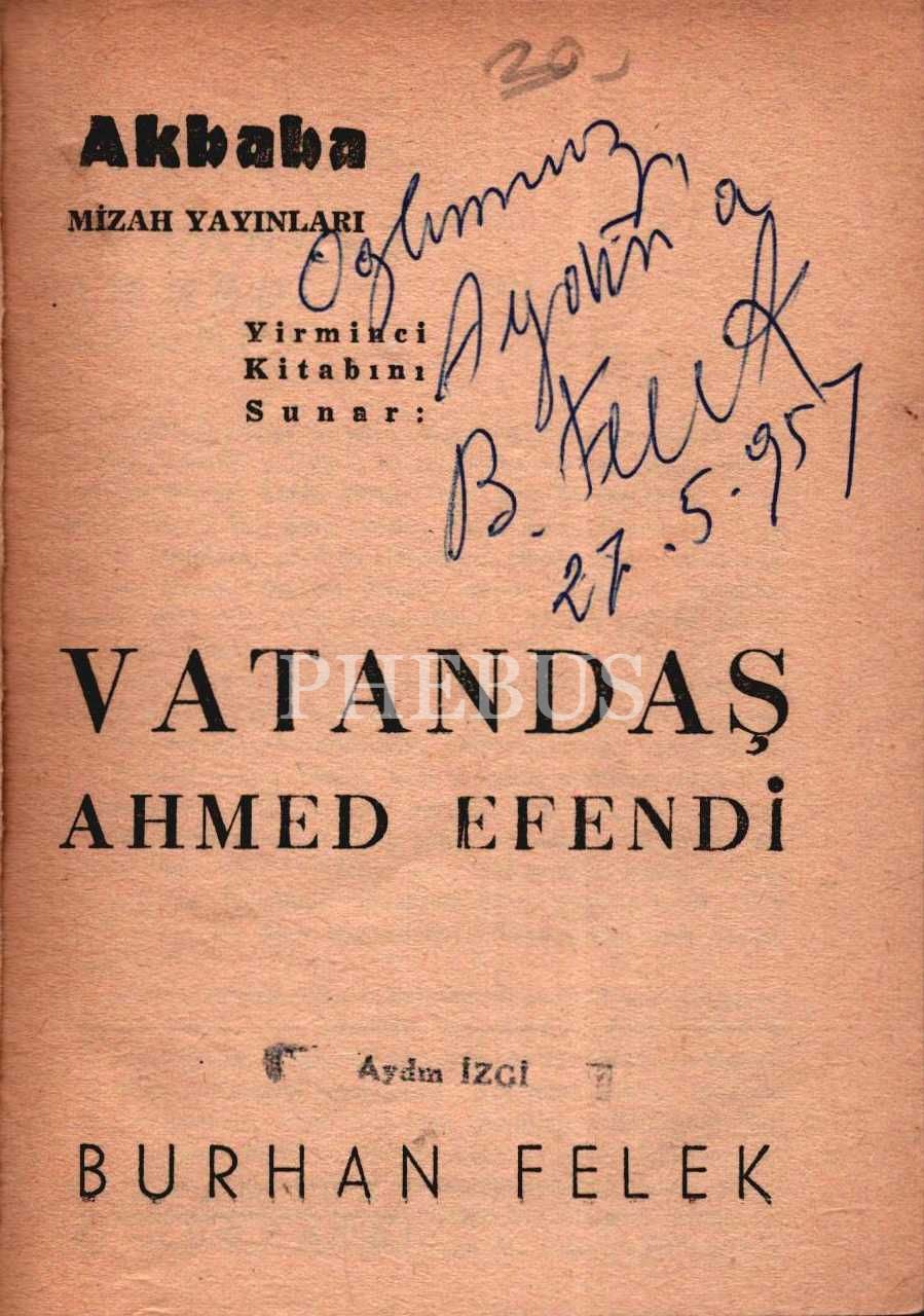 VATANDAŞ AHMET EFENDİ, Burhan Felek, 1957, Yeni Matbaa, 96 sayfa, 12x17 cm, İTHAFLI VE İMZALI...