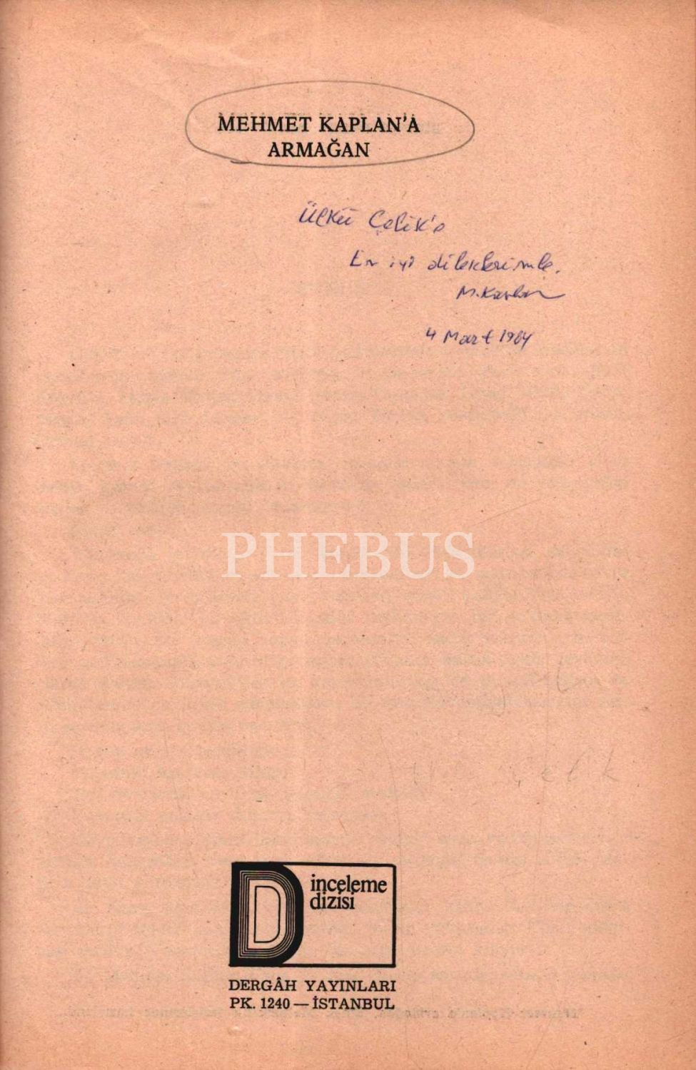 İthaf, " Ülkü Çelik´e en iyi dileklerimle. 4 Mart 1984" şeklindedir.