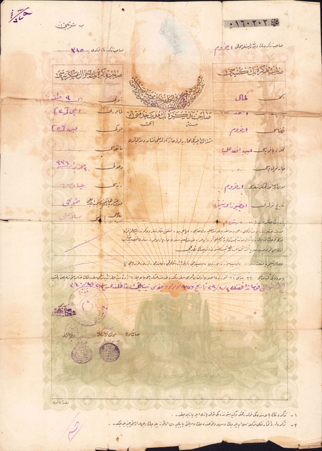 Osmanlı seferberlik münasebeti ile silah altına alınacak zabitana mahsus terhis tezkeresi, 1340 tarihli, haliyle, 22x32 cm
