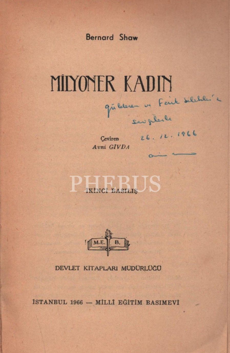 MİLYONER KADIN, Bernard Shaw, çeviren: Avni Givda, 1966, Milli Eğitim Basımevi, 106 sayfa, 12x18 cm, İTHAFLI VE İMZALI...