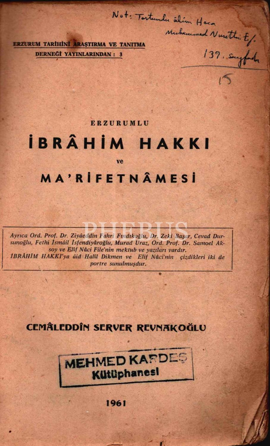 ERZURUMLU İBRAHİM HAKKI ve MA´RİFETNÂMESİ, Cemaleddin Server Revnakoğlu, 1961, Erzurum Tarihini Araştırma ve Tanıtma Derneği Yayınları, 224 sayfa, 17x25 cm, Muhammet Nurettin Efendi tarafından İMZALI...