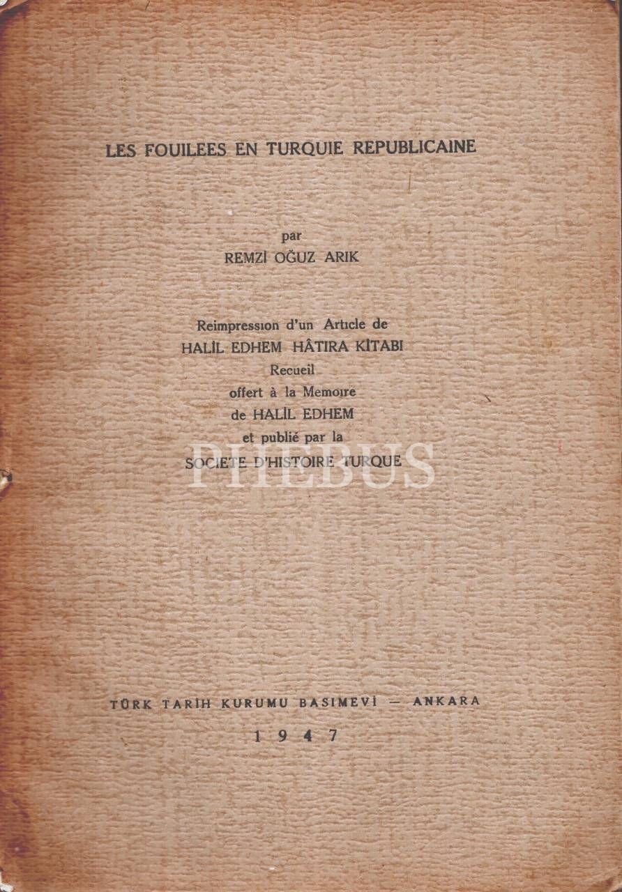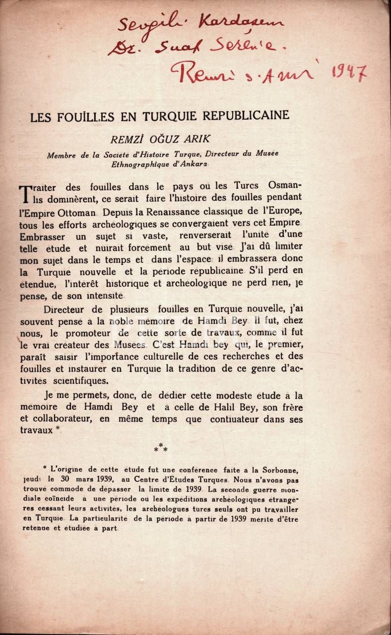 LES FOUILEES EN TURQUIE REPUBLICAINE, Remzi Oğuz Arık, 1947, Türk Tarih Kurumu Basımevi, 28 sayfa,17x25 cm, İTHAFLI VE İMZALI...