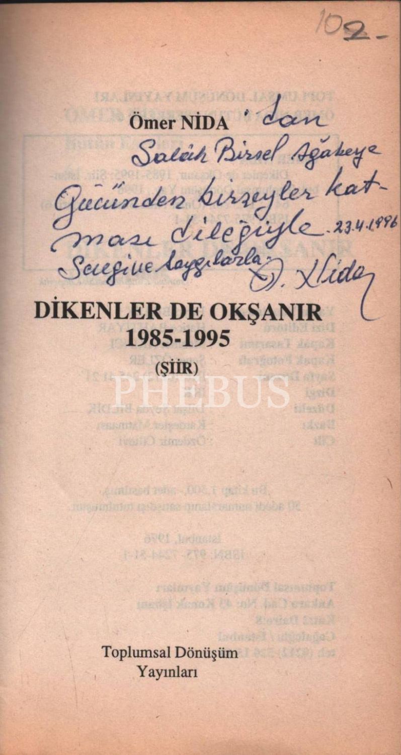 DİKENLER DE OKŞANIR, Ömer Nida, 1996, Toplumsal Dönüşüm Yayınları, 60 sayfa, 11x20 cm, İTHAFLI VE İMZALI...