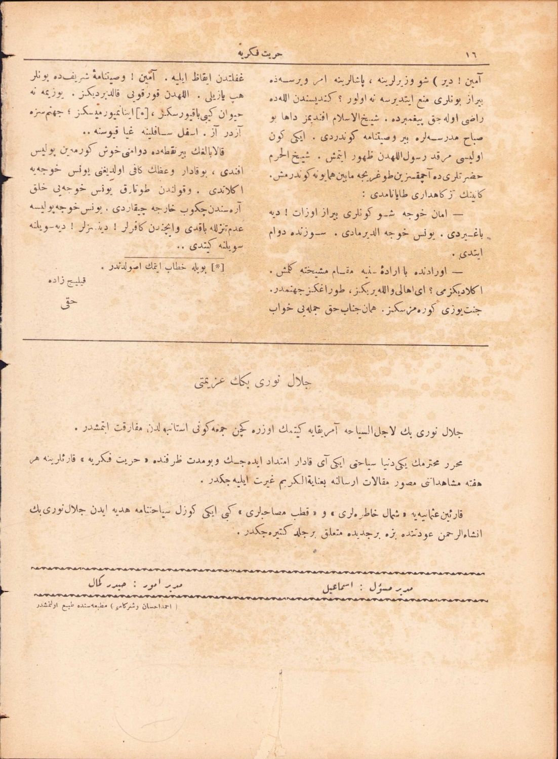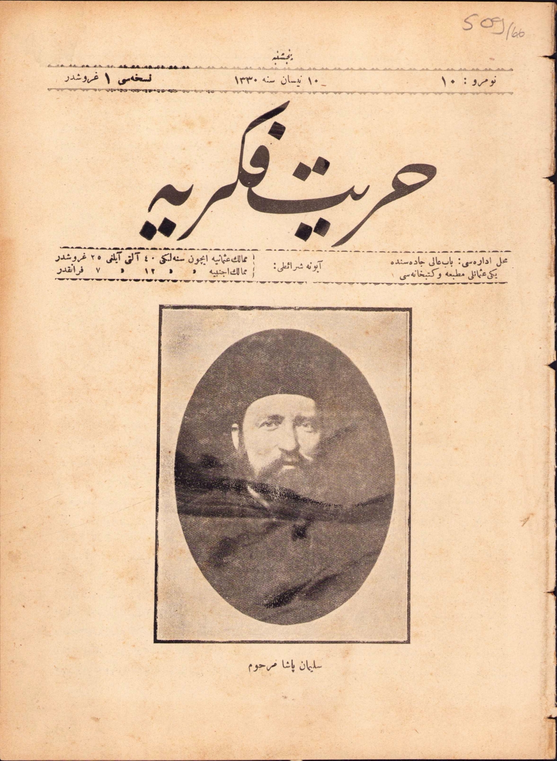 Osmanlıca Hürriyet-i Fikriye gazetesi, 1 Nisan 1330, kapak merhum Süleyman Paşa,16 sayfa, 18x24 cm