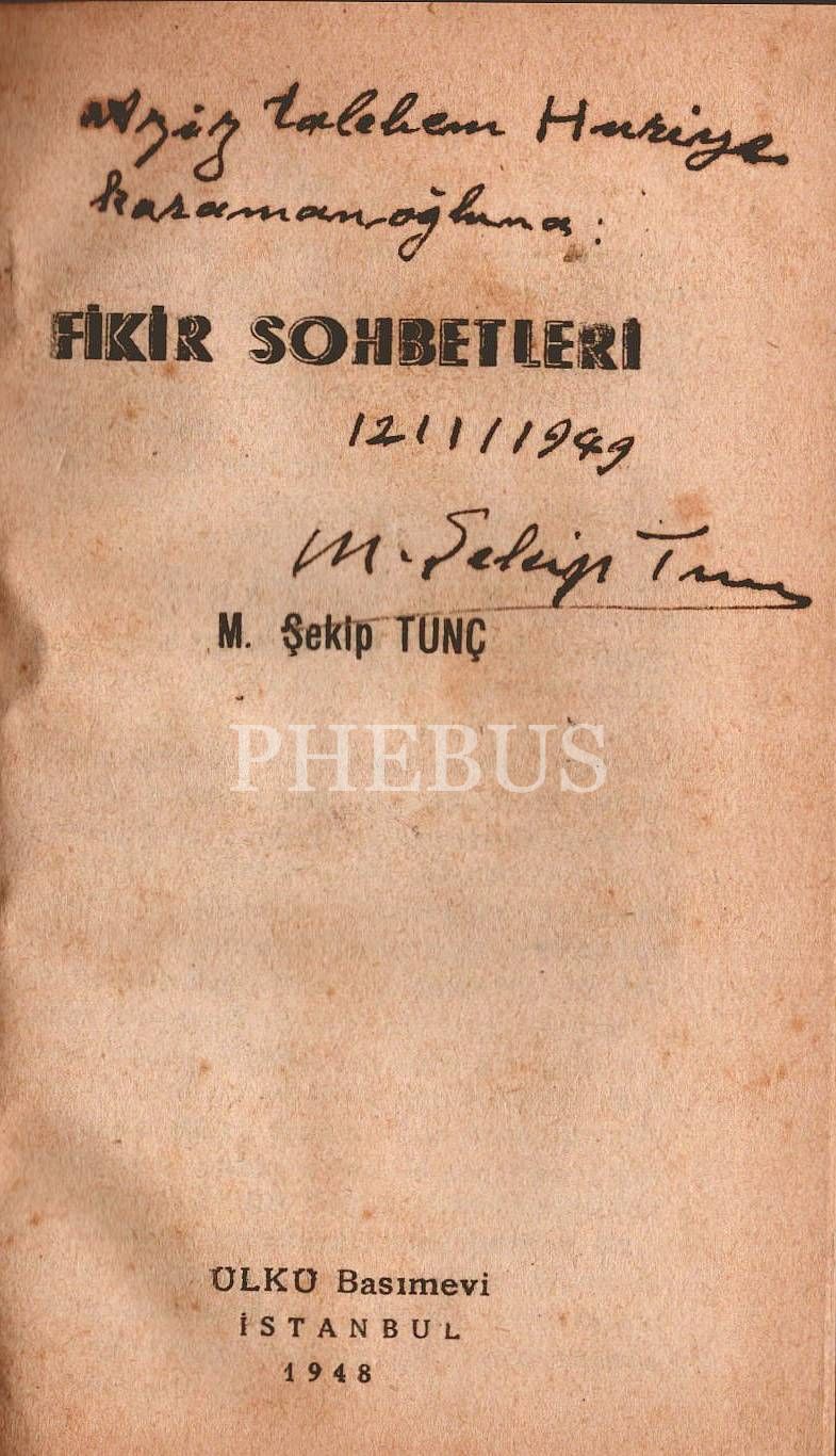 FİKİR SOHBETLERİ, M. Şekip Tunç, 1948, Ülkü Basımevi, 203 sayfa, 11x18 cm, İTHAFLI VE İMZALI...
