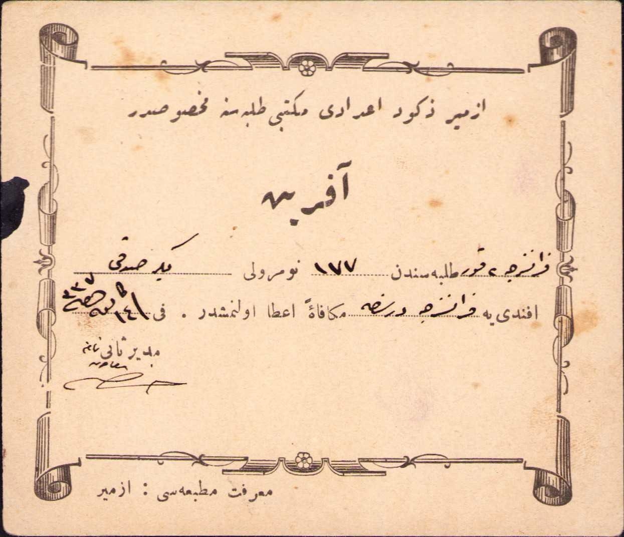 Osmanlı Aferin belgesi, İzmir Zükur İdadi Mektebi, 1327 tarihli, 10x8 cm