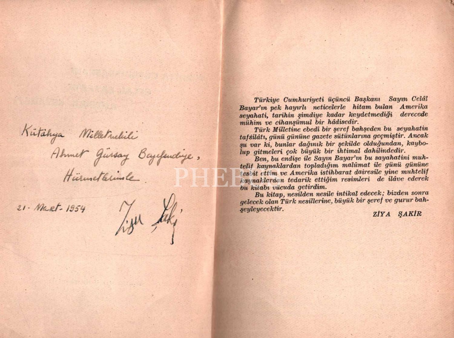 İthaf, " Kütahya Milletvekili Ahmet Günsoy Beyefendiye, hürmetlerimle. 21. Mart . 1954" şeklindedir.