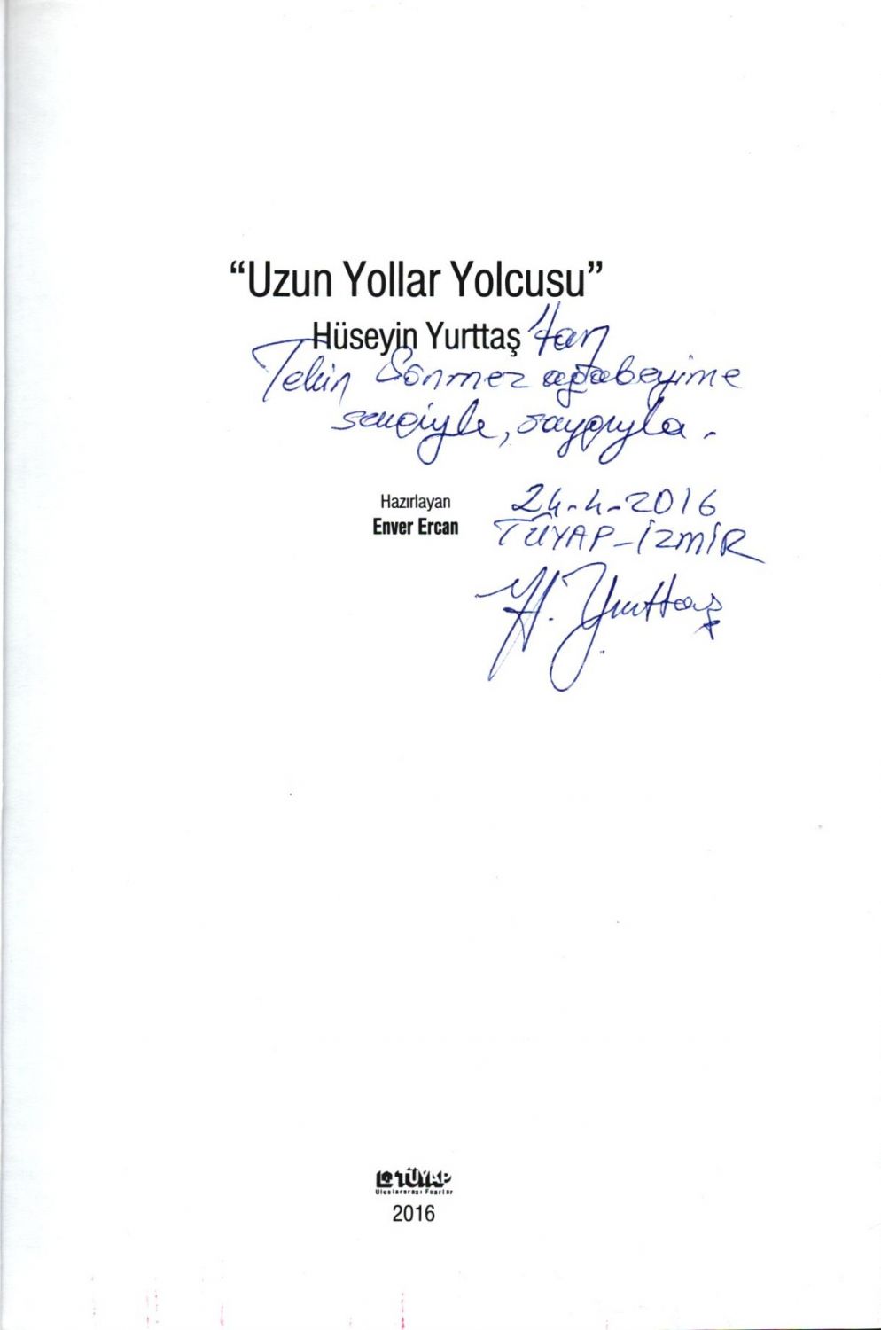 UZUN YOLLAR YOLCUSU, Hüseyin Yurttaş, 2016, TÜYAP, 311 sayfa, 16x24 cm, İTHAFLI VE İMZALI...