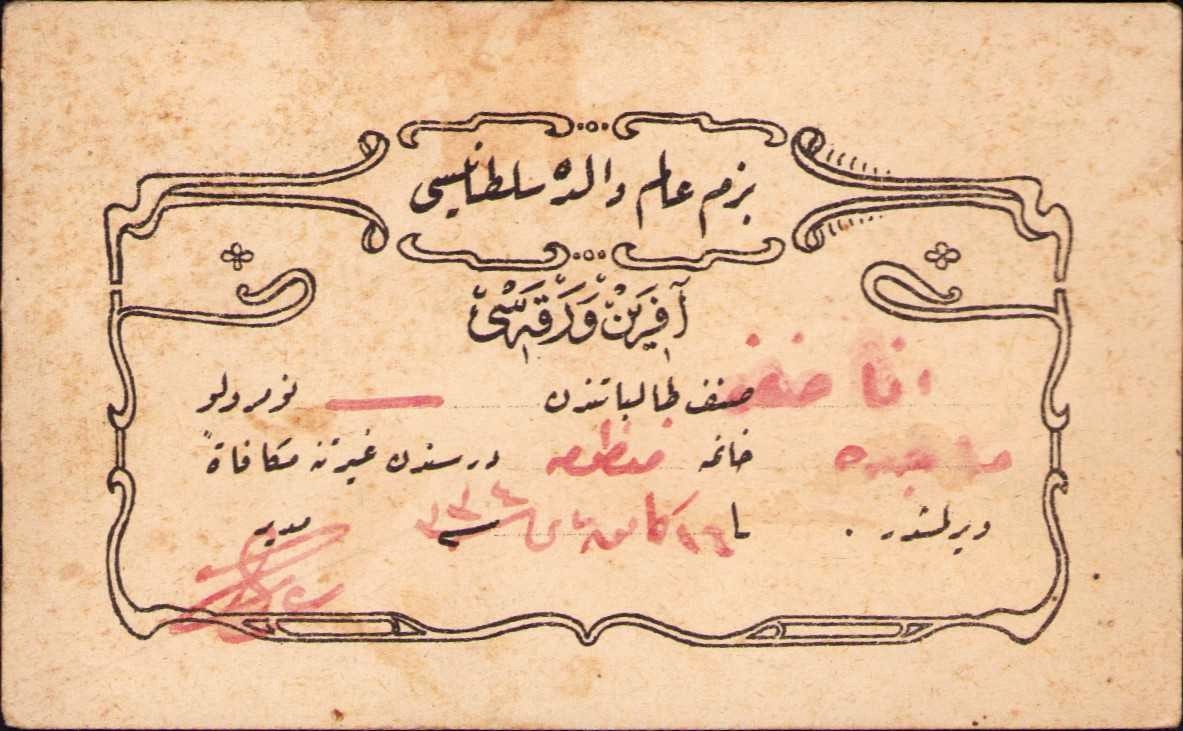 Osmanlı Aferin belgesi, Bezmialem Valide-i Sultanisi, 1334 tarihli, mühürlü, 9x6 cm