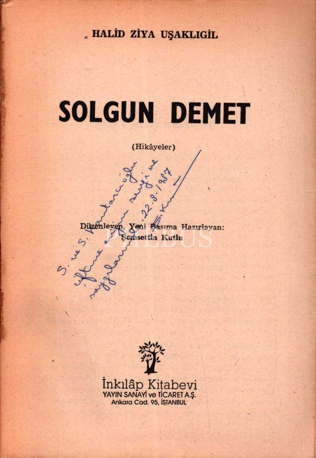 SOLGUN DEMET, Halit Ziya Uşaklıgil, düzenleyen: Şemsettin Kutlu, 1987, Sümbül Basımevi, 206 sayfa, 14x20 cm, Şemsettin Kutlu´dan İTHAFLI VE İMZALI...