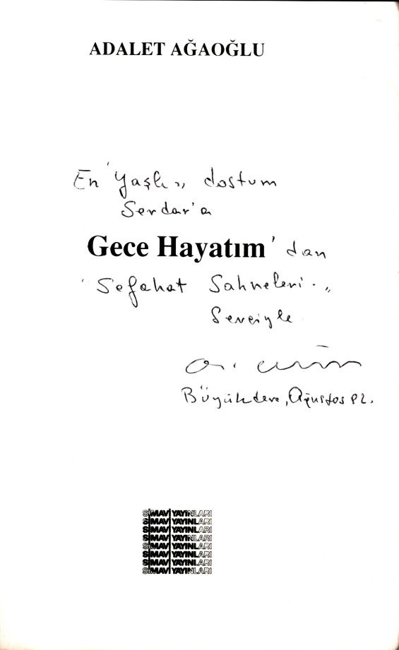 İthaf, " En yaşlı dostum Serdar´a Gece Hayatım´dan Sefahat sahneleri. Sevgiyle. Büyükdere, Ağustos 92´" şeklindedir.