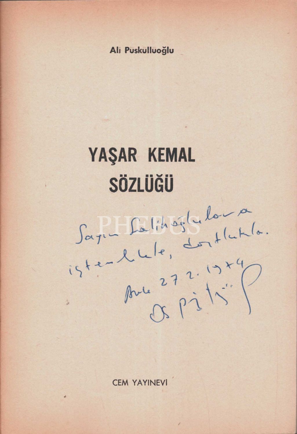 YAŞAR KEMAL SÖZLÜĞÜ, Ali Püsküllüoğlu, 1974, Cem Yayınevi, 96 sayfa, 14x20 cm, İTHAFLI VE İMZALI...
