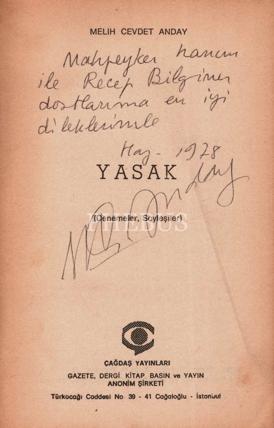 YASAK, Melih Cevdet Anday, 1978, Çağdaş Yayınları, 278 sayfa, 13x20 cm, İTHAFLI VE İMZALI...
