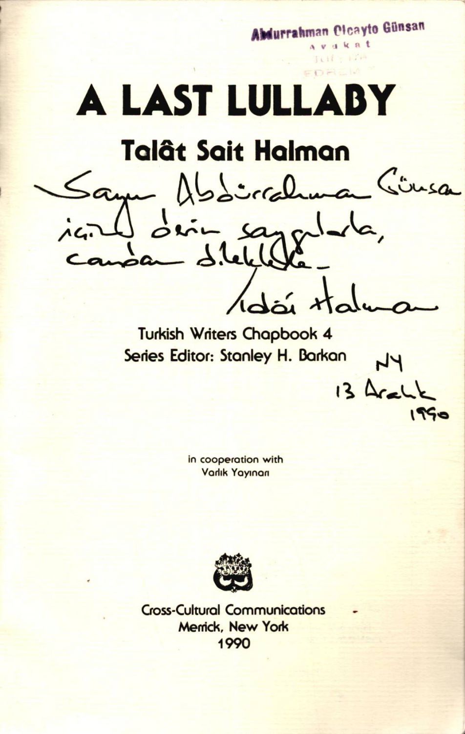 A LAST LULLABY, Talat Sait Halman, 1990, Cross-Cultural Communications, 48 sayfa, 14x21 cm, İTHAFLI VE İMZALI...