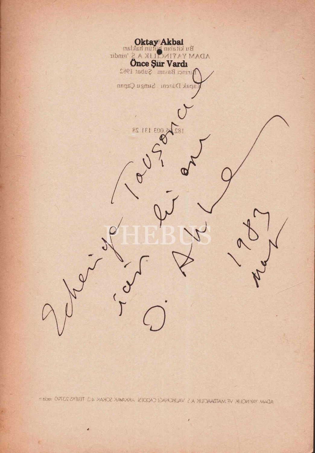 İthaf, " Zekeriya Tavşancı için bi anı. 1983 Mart" şeklindedir.
