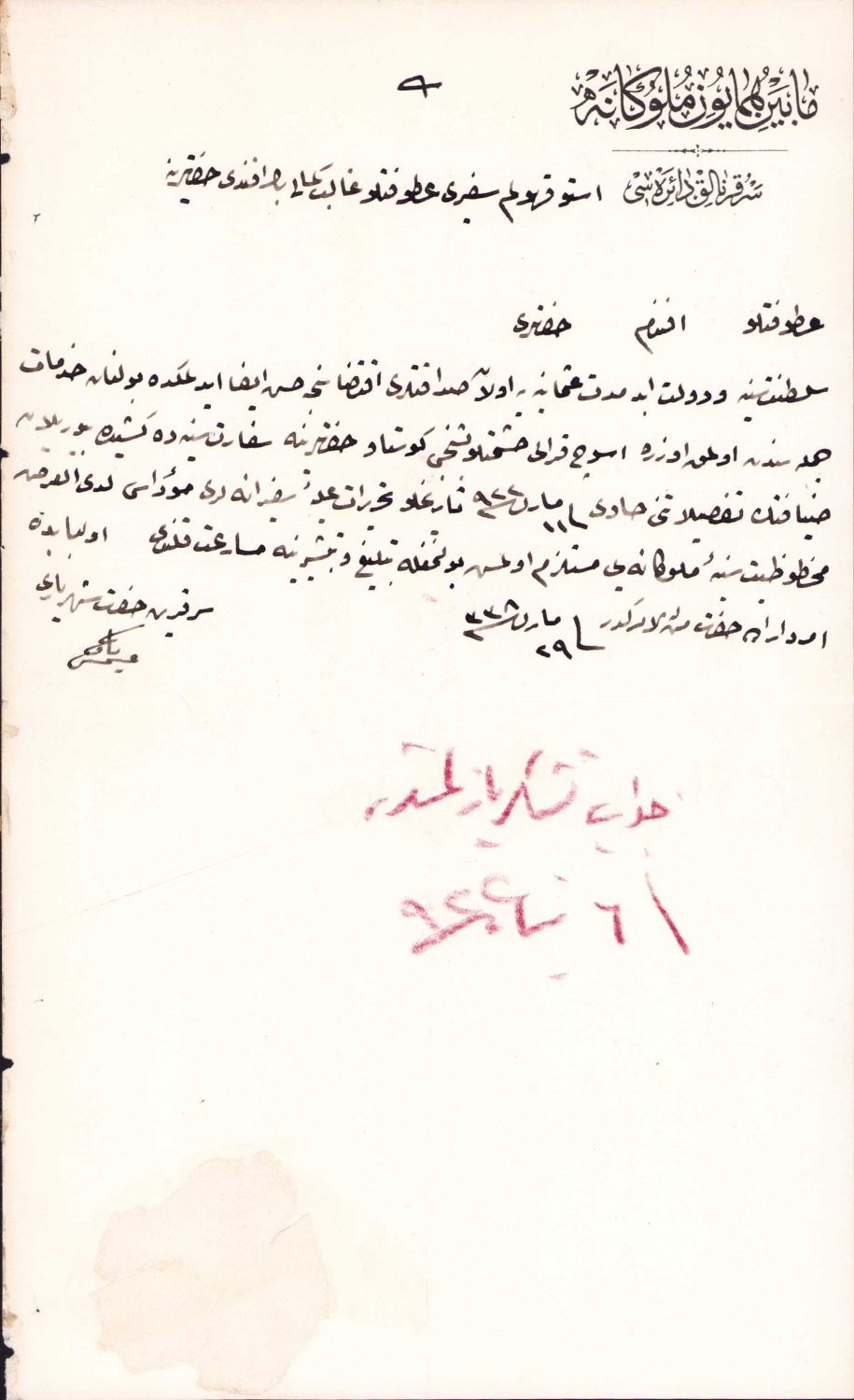 Osmanlı Mabeyni Hümayun Mülükane serkurnalık dairesi antetli 1338 tarihli Galip Kemali Bey'e yazılmış evrak, 15x25 cm