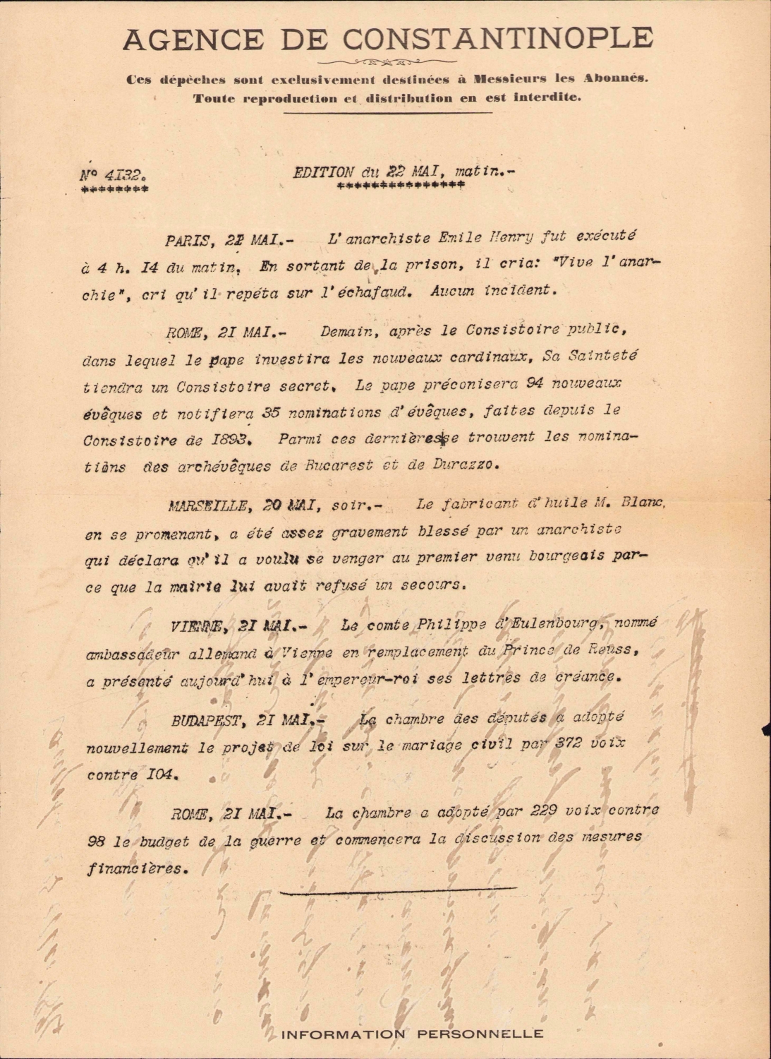 Agence De Constantinople antetli 1894 tarihli Fransızca doküman, 24x34 cm