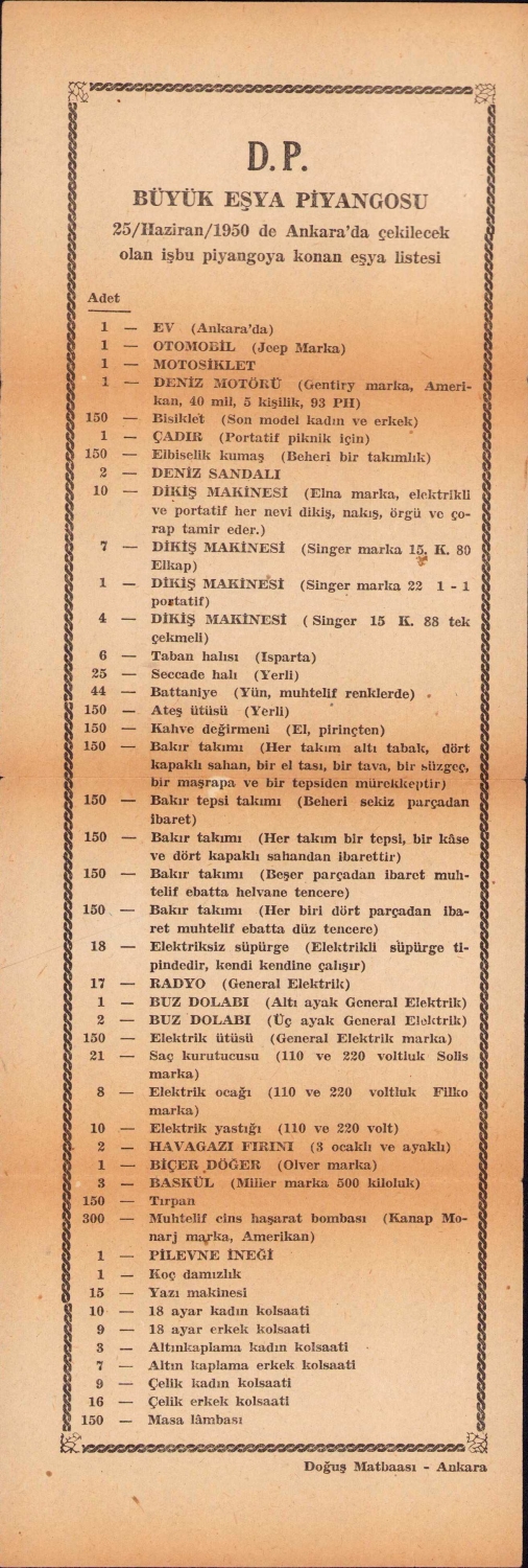 Demokrat Parti Büyük Eşya Piyangosu, 1950 yılında yapılacak çekilişin eşya listesi, 10x32