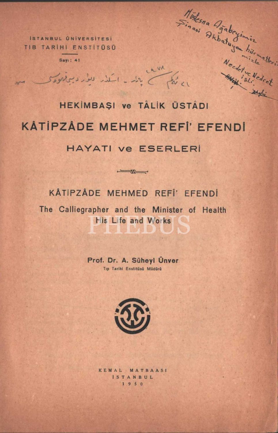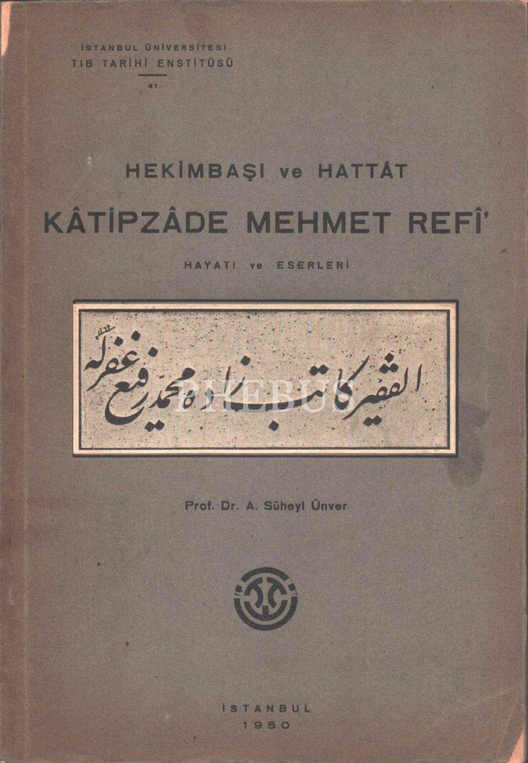 HEKİMBAŞI VE HATTAT KÂTİPZÂDE MEHMET REFİ´ HAYATI VE ESERLERİ, Süheyl Ünver, 1950, Kemal Matbaası, 94 sayfa, 17x24 cm...