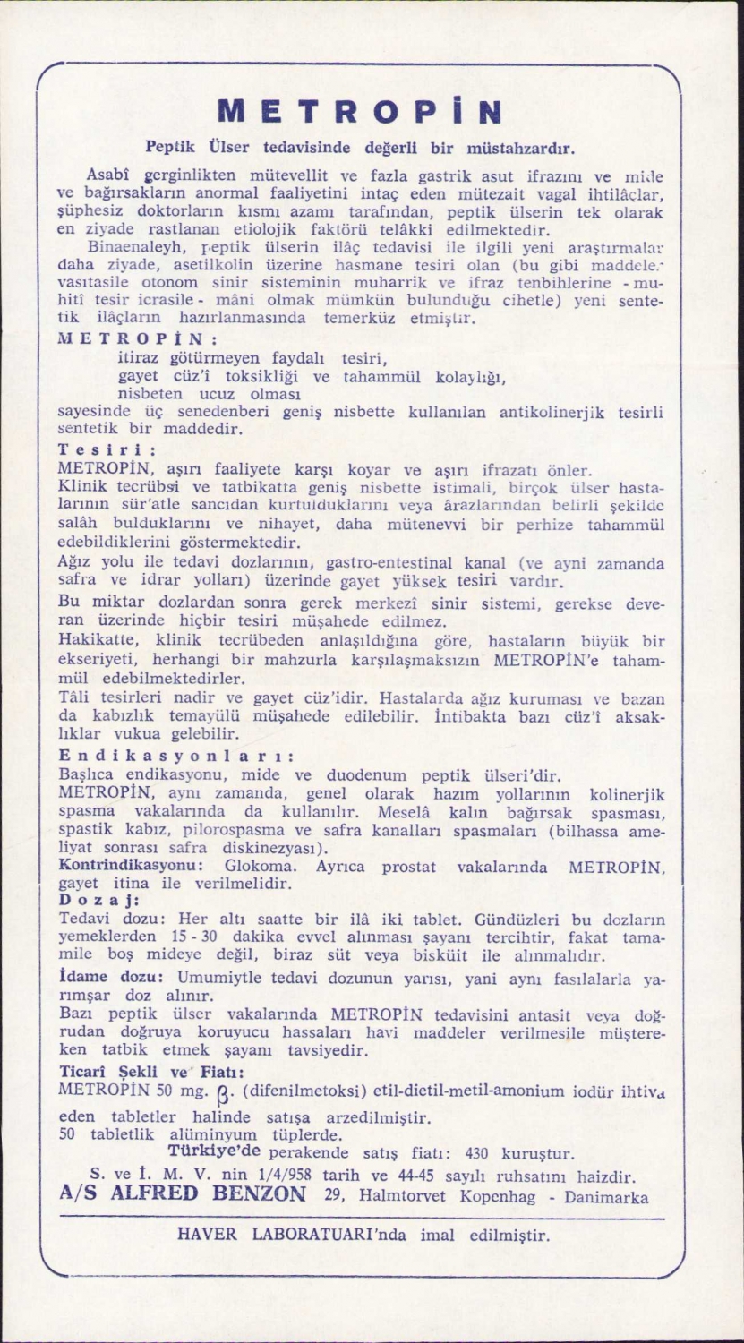Haver Laboratuarı, Metropin ilacı, orijinal kutusunda, 2,5x5 cm