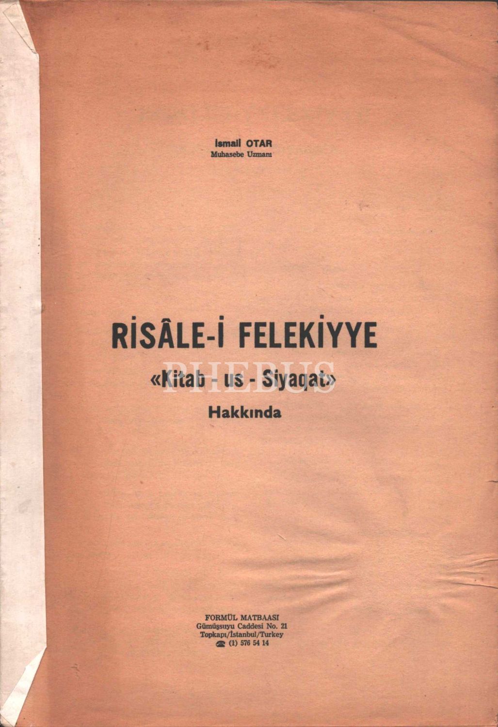 RİSALE-İ FELEKİYE KİTAB-US-SİYAQAT, İsmail Otar, Formül Matbaası, 27 sayfa, 19x28 cm...