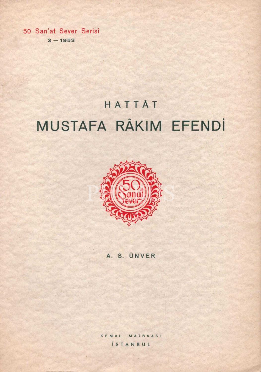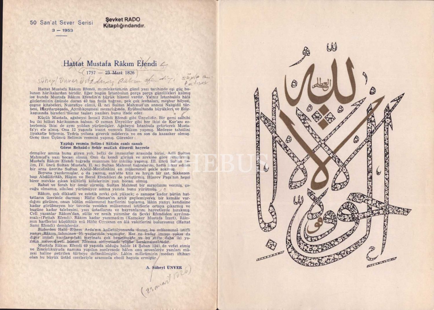 50 Sanat Sever Serisi´nin 1953 senesi "HATTAT MUSTAFA RAKIM EFENDİ" başlıklı 3. sayısı, A. S. Ünver, 2 sayfa, 18x25 cm...