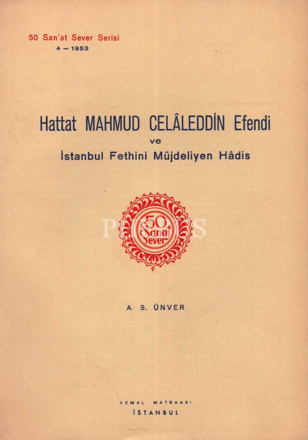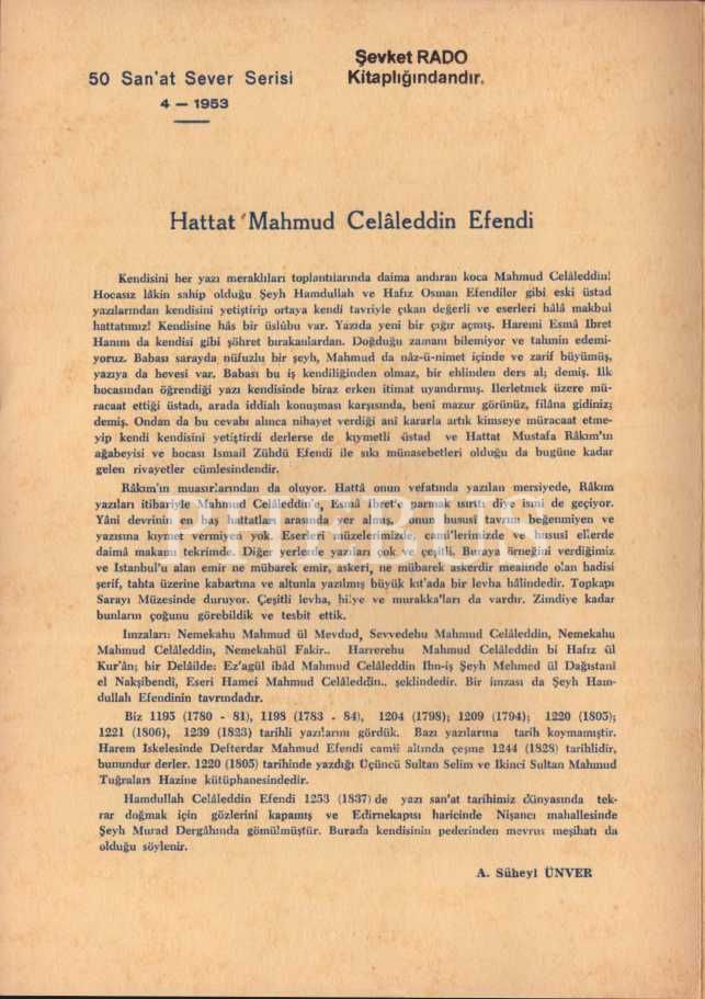 50 Sanat Sever Serisi´nin 1953 senesi "HATTAT MAHMUD CELÂLEDDİN EFENDİ VE İSTANBUL FETHİNİ MÜJDELİYEN HADİS" başlıklı 4. sayısı, A. S. Ünver, 2 sayfa, 18x25 cm...